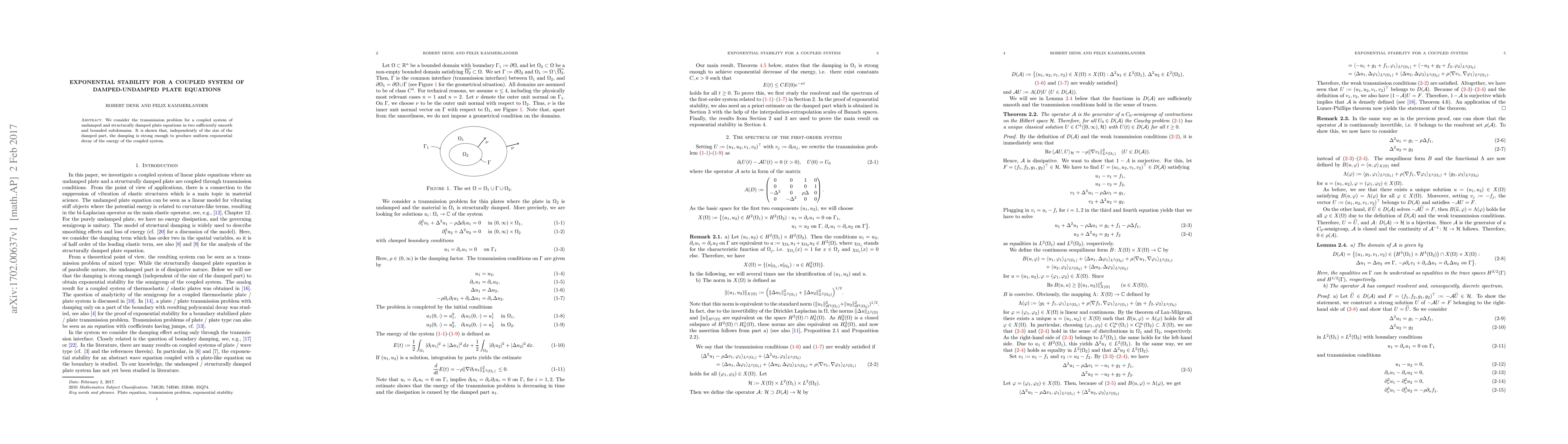 Summary: This paper investigates a coupled system of damped and undamped plate equations, demonstrating that sufficient damping in the system leads to uniform exponential decay of energy, regardless of the size of the damped part. The results highlight the effectiveness of damping in stabilizing the system.