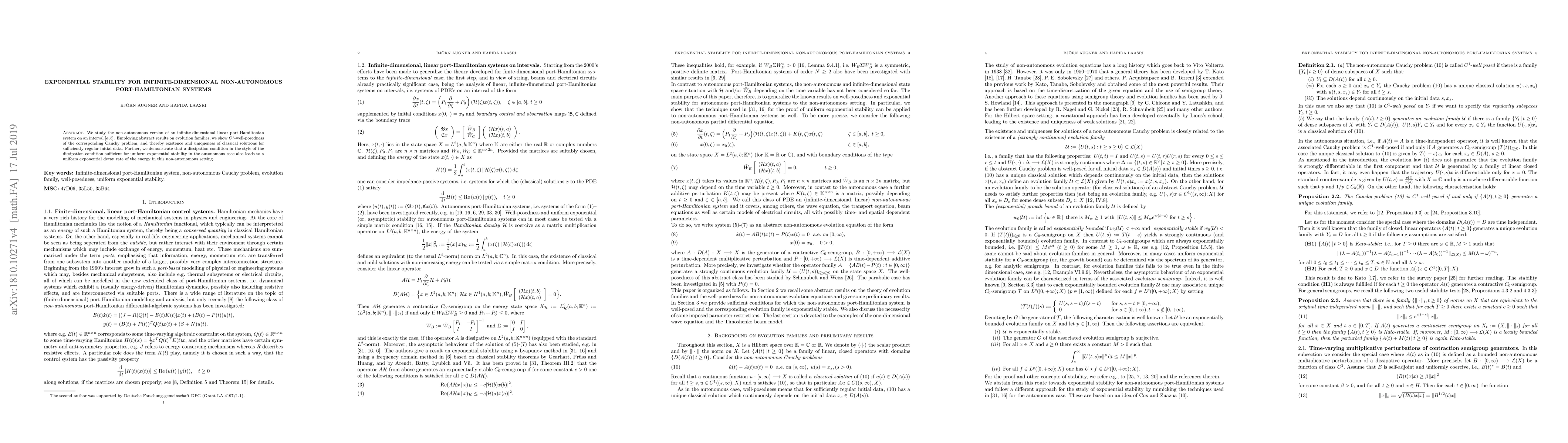 We study the non-autonomous version of an infinite-dimensional port-Hamiltonian system on an interval $[a, b]$. Employing abstract results on evolution families, we show $C^1$-well-posedness of the corresponding Cauchy problem, and thereby existence and uniqueness of classical solutions for sufficiently regular initial data. Further, we demonstrate that a dissipation condition in the style of the dissipation condition sufficient for uniform exponential stability in the autonomous case also leads to a uniform exponential decay of the energy in this non-autonomous setting.