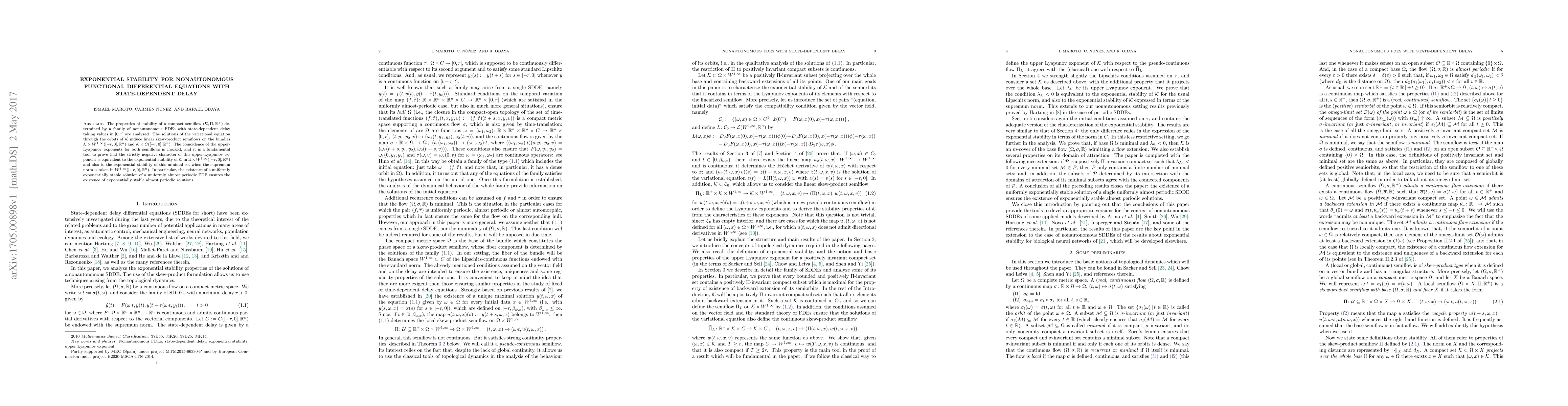 The paper analyzes stability of compact sets in nonautonomous functional differential equations with state-dependent delay, finding that exponential stability is equivalent to a strictly negative upper-Lyapunov exponent.