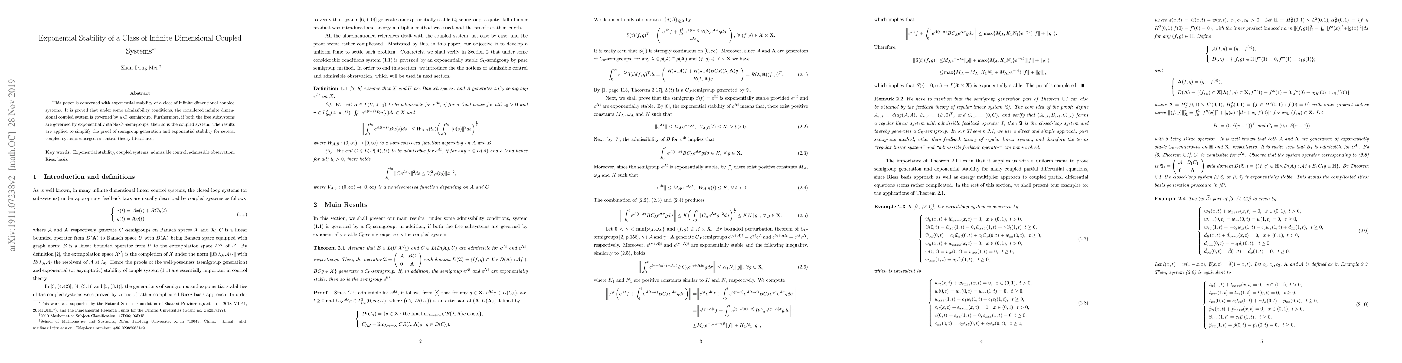 This paper proves exponential stability for a class of infinite dimensional coupled systems under admissibility conditions, showing that the system is governed by a $C_0$-semigroup. It also demonstrates that if the individual subsystems are exponentially stable, the coupled system inherits the same stability.