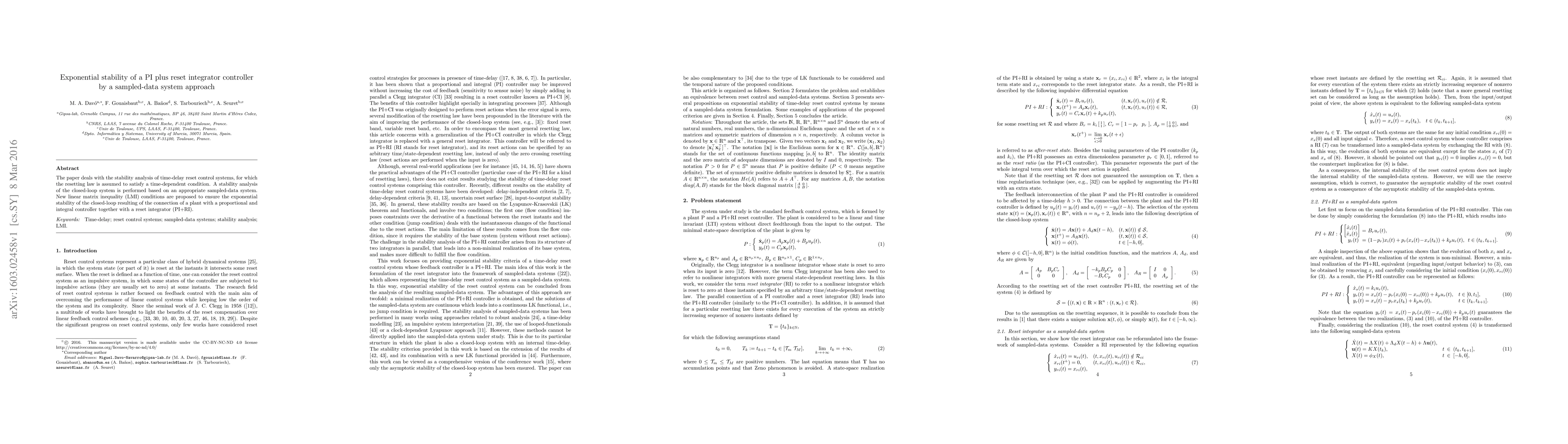 The paper deals with the stability analysis of time-delay reset control systems, for which the resetting law is assumed to satisfy a time-dependent condition. A stability analysis of the closed-loop system is performed based on an appropriate sampled-data system. New linear matrix inequality (LMI) conditions are proposed to ensure the exponential stability of the closed-loop resulting of the connection of a plant with a proportional and integral controller together with a reset integrator (PI+RI).