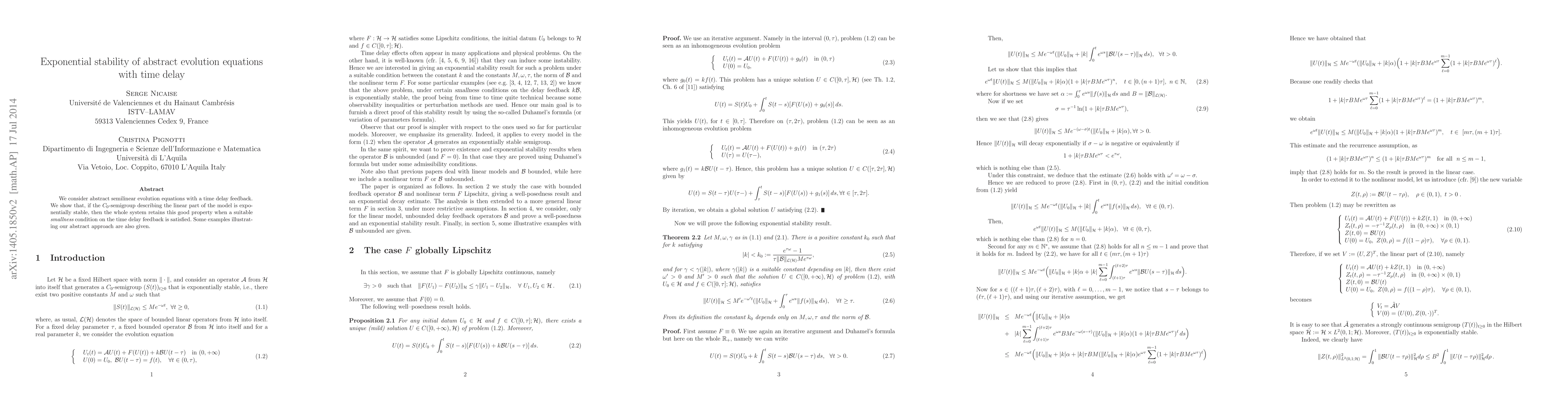We consider abstract semilinear evolution equations with a time delay feedback. We show that, if the $C_0$-semigroup describing the linear part of the model is exponentially stable, then the whole system retains this good property when a suitable smallness condition on the time delay feedback is satisfied. Some examples illustrating our abstract approach are also given.