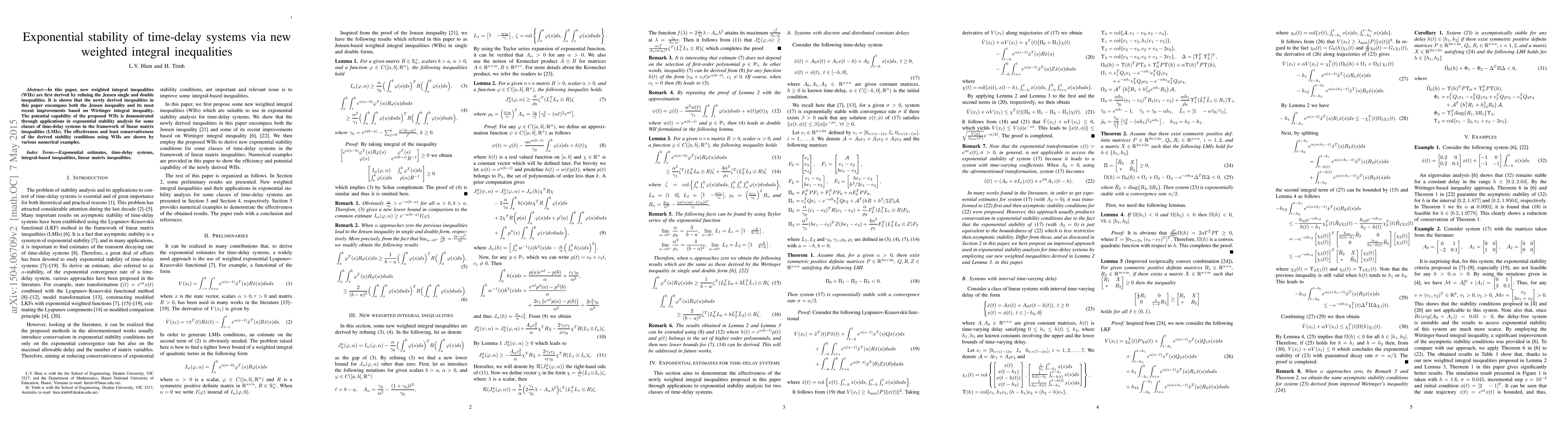 This paper introduces new weighted integral inequalities derived from refined Jensen inequalities, which encompass existing results and improve upon them. These inequalities are applied to analyze the exponential stability of time-delay systems, demonstrating enhanced effectiveness and reduced conservatism compared to traditional methods.