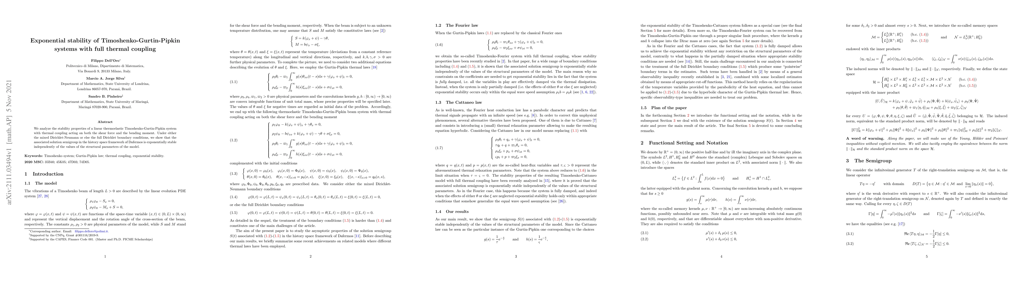 We analyze the stability properties of a linear thermoelastic Timoshenko-Gurtin-Pipkin system with thermal coupling acting on both the shear force and the bending moment. Under either the mixed Dirichlet-Neumann or else the full Dirichlet boundary conditions, we show that the associated solution semigroup in the history space framework of Dafermos is exponentially stable independently of the values of the structural parameters of the model.