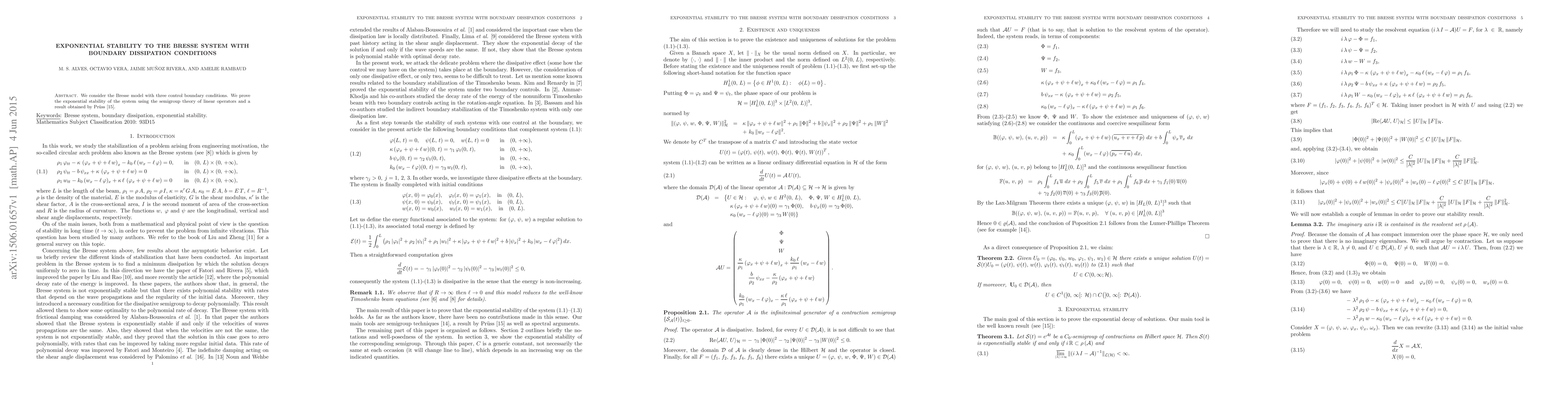 Summary: This paper investigates the Bresse system with three boundary dissipation conditions, proving exponential stability through semigroup theory and leveraging a result by Pr\"uss. The analysis ensures the system's stability over time.