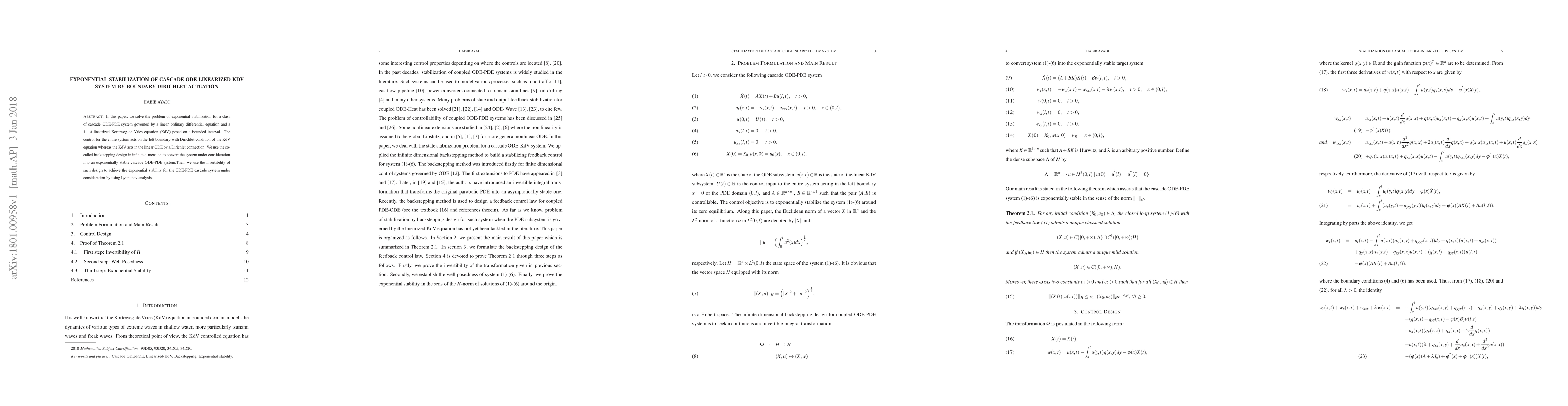 This paper addresses exponential stabilization of a cascade ODE-PDE system combining a linear ordinary differential equation and a 1-d linearized KdV equation. It employs backstepping design and Lyapunov analysis to achieve exponential stability through boundary Dirichlet actuation on the left boundary of the KdV equation.