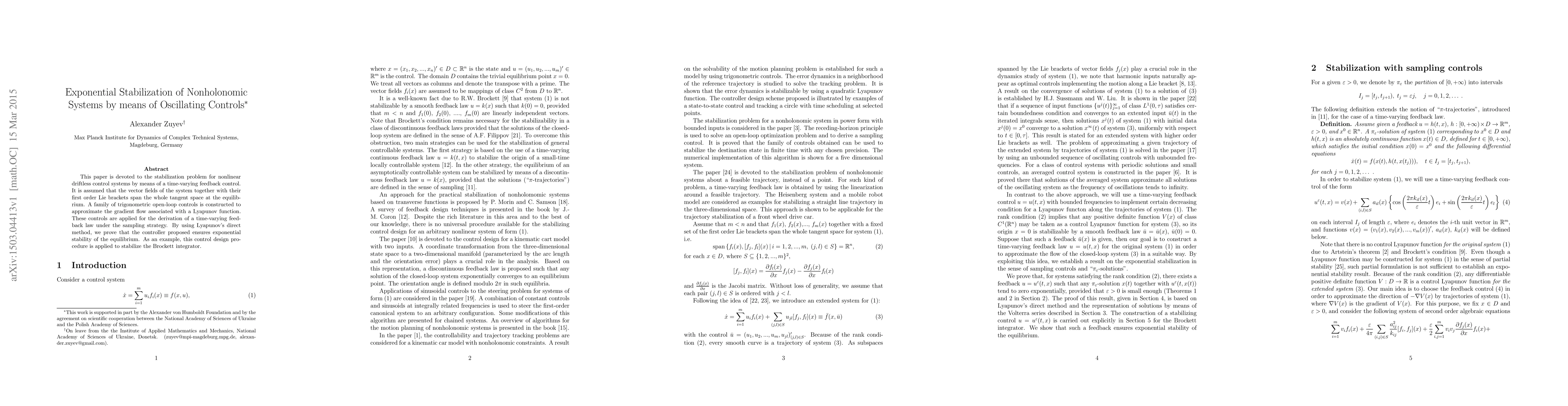 This paper is devoted to the stabilization problem for nonlinear driftless control systems by means of a time-varying feedback control. It is assumed that the vector fields of the system together with their first order Lie brackets span the whole tangent space at the equilibrium. A family of trigonometric open-loop controls is constructed to approximate the gradient flow associated with a Lyapunov function. These controls are applied for the derivation of a time-varying feedback law under the sampling strategy. By using Lyapunov's direct method, we prove that the controller proposed ensures exponential stability of the equilibrium. As an example, this control design procedure is applied to stabilize the Brockett integrator.