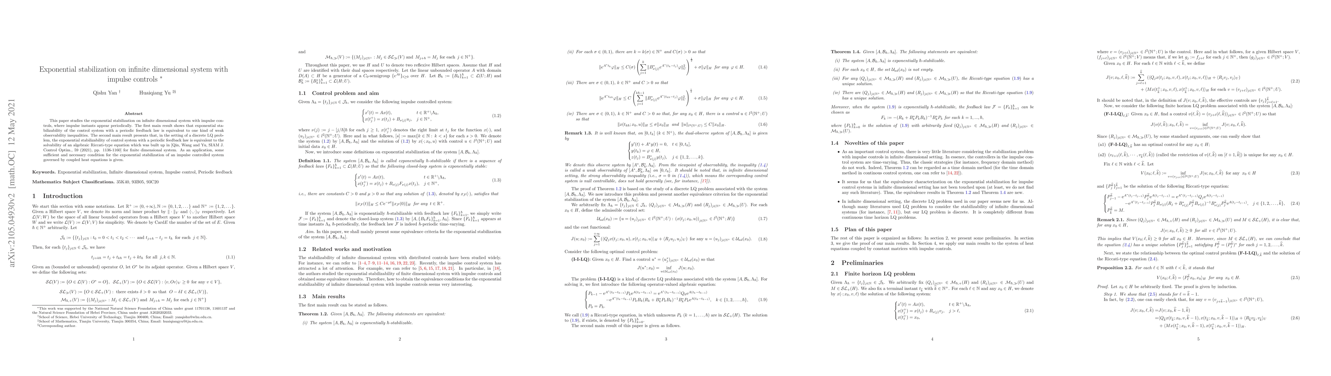 This paper investigates the exponential stabilization of infinite-dimensional systems using periodic impulse controls, establishing equivalences between stabilizability and weak observability inequalities, as well as algebraic Riccati-type equations. It also provides conditions for the stabilization of systems modeled by coupled heat equations.