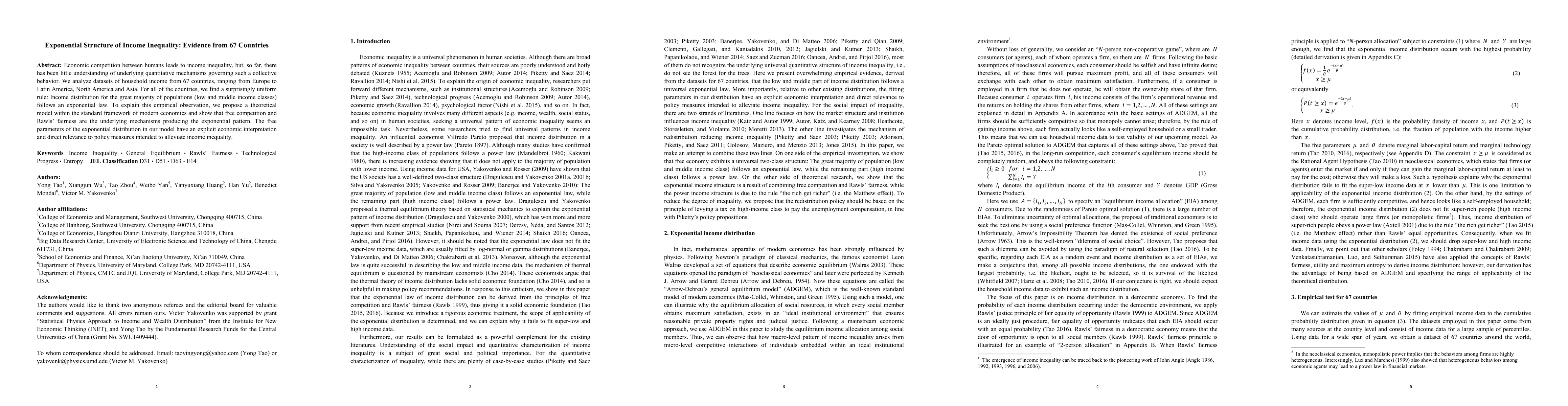 This research finds that income distribution for low and middle-income classes across 67 countries follows an exponential law, driven by free competition and Rawls' fairness principles. The study proposes a theoretical model explaining this pattern and highlights the relevance of its parameters for policy measures to address income inequality.