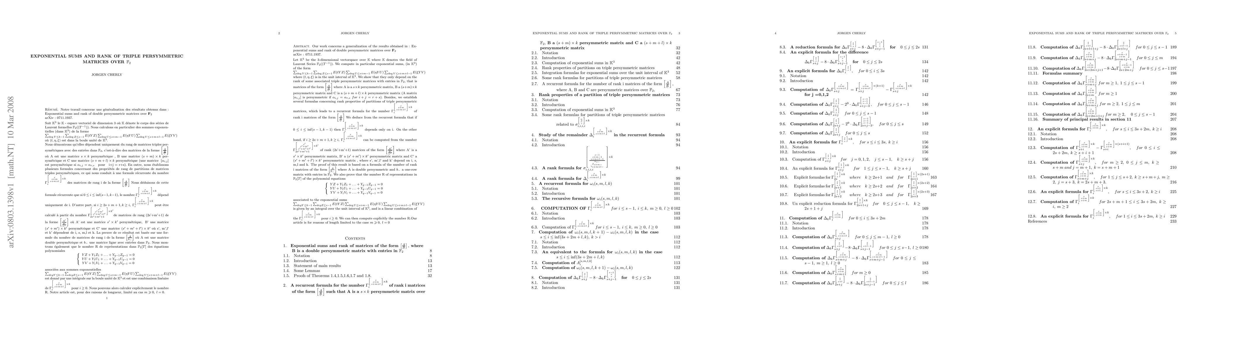 Summary: This paper derives explicit expressions for the number of triple persymmetric matrices over the finite field F_2 based on rank using exponential quadratic sums. It provides a method to determine the rank of such matrices through a novel application of exponential sums.