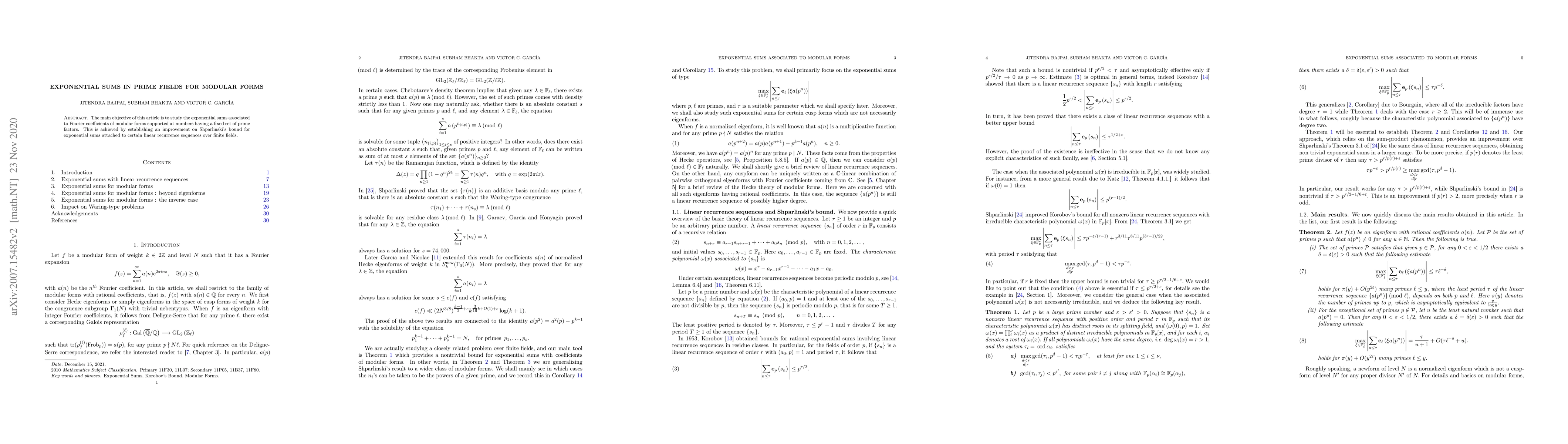 The main objective of this article is to study the exponential sums associated to Fourier coefficients of modular forms supported at numbers having a fixed set of prime factors. This is achieved by establishing an improvement on Shparlinski's bound for exponential sums attached to certain recurrence sequences over finite fields.