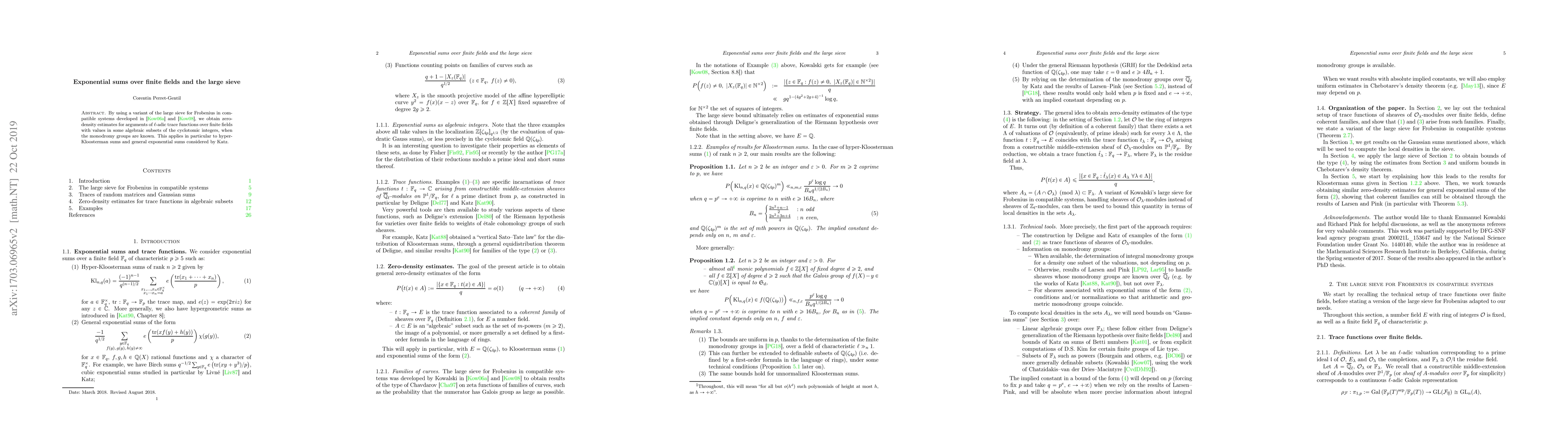 This paper utilizes a modified large sieve for Frobenius to derive zero-density estimates for $\ell$-adic trace functions over finite fields, particularly for hyper-Kloosterman sums and general exponential sums, leveraging the known monodromy groups.