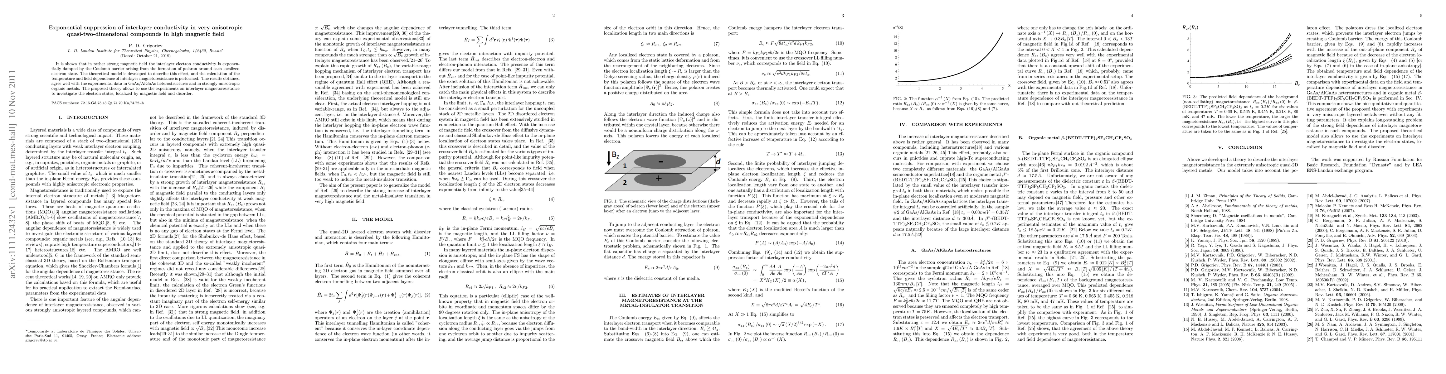 This research demonstrates the exponential suppression of interlayer conductivity in highly anisotropic quasi-two-dimensional compounds under strong magnetic fields, attributing it to the Coulomb barrier from polaron formation. The theoretical model aligns with experimental data in GaAs/AlGaAs heterostructures and organic metals, offering insights into electron states localized by magnetic fields and disorder.