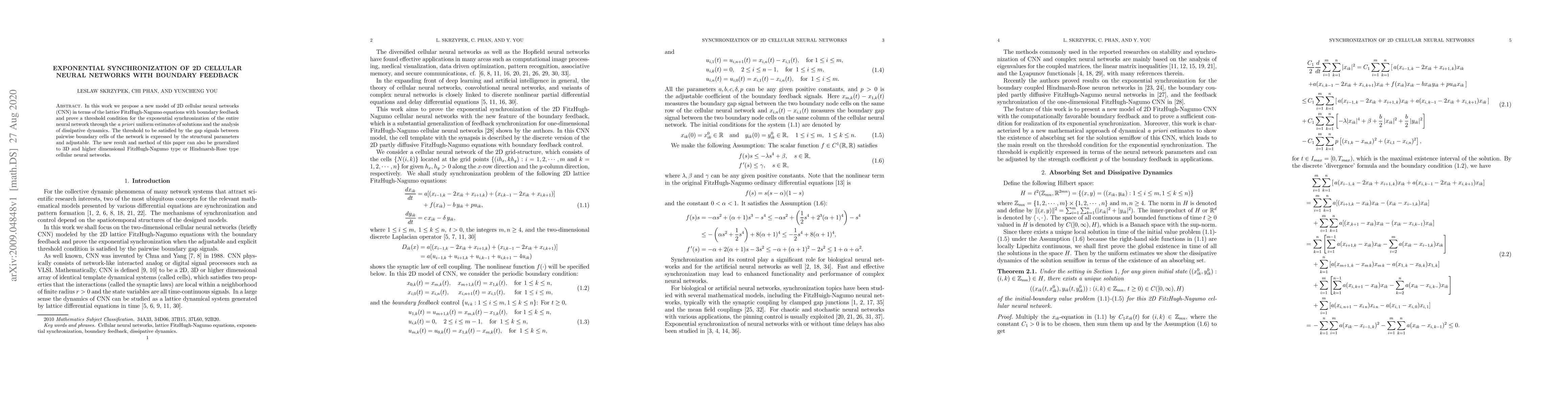 This paper introduces a novel model for 2D cellular neural networks based on lattice FitzHugh-Nagumo equations with boundary feedback, establishing a threshold condition for exponential synchronization. The synchronization is achieved through uniform estimates of solutions and analysis of dissipative dynamics, with the threshold dependent on the structural parameters. The findings can potentially be extended to 3D and higher-dimensional networks of similar types.