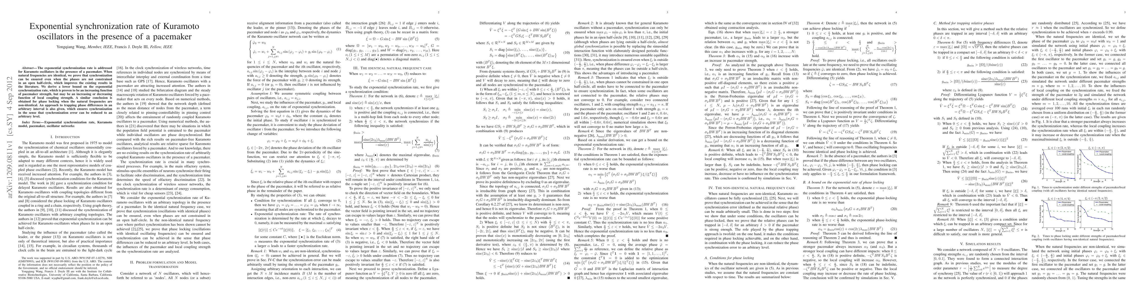 The exponential synchronization rate is addressed for Kuramoto oscillators in the presence of a pacemaker. When natural frequencies are identical, we prove that synchronization can be ensured even when the phases are not constrained in an open half-circle, which improves the existing results in the literature. We derive a lower bound on the exponential synchronization rate, which is proven to be an increasing function of pacemaker strength, but may be an increasing or decreasing function of local coupling strength. A similar conclusion is obtained for phase locking when the natural frequencies are non-identical. An approach to trapping phase differences in an arbitrary interval is also given, which ensures synchronization in the sense that synchronization error can be reduced to an arbitrary level.