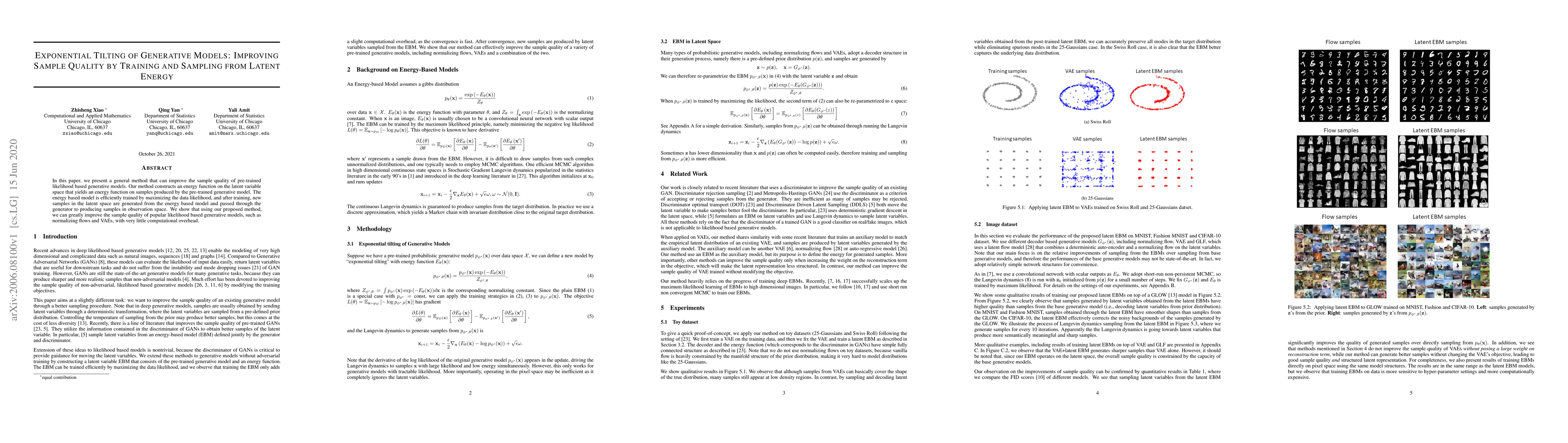 In this paper, we present a general method that can improve the sample quality of pre-trained likelihood based generative models. Our method constructs an energy function on the latent variable space that yields an energy function on samples produced by the pre-trained generative model. The energy based model is efficiently trained by maximizing the data likelihood, and after training, new samples in the latent space are generated from the energy based model and passed through the generator to producing samples in observation space. We show that using our proposed method, we can greatly improve the sample quality of popular likelihood based generative models, such as normalizing flows and VAEs, with very little computational overhead.