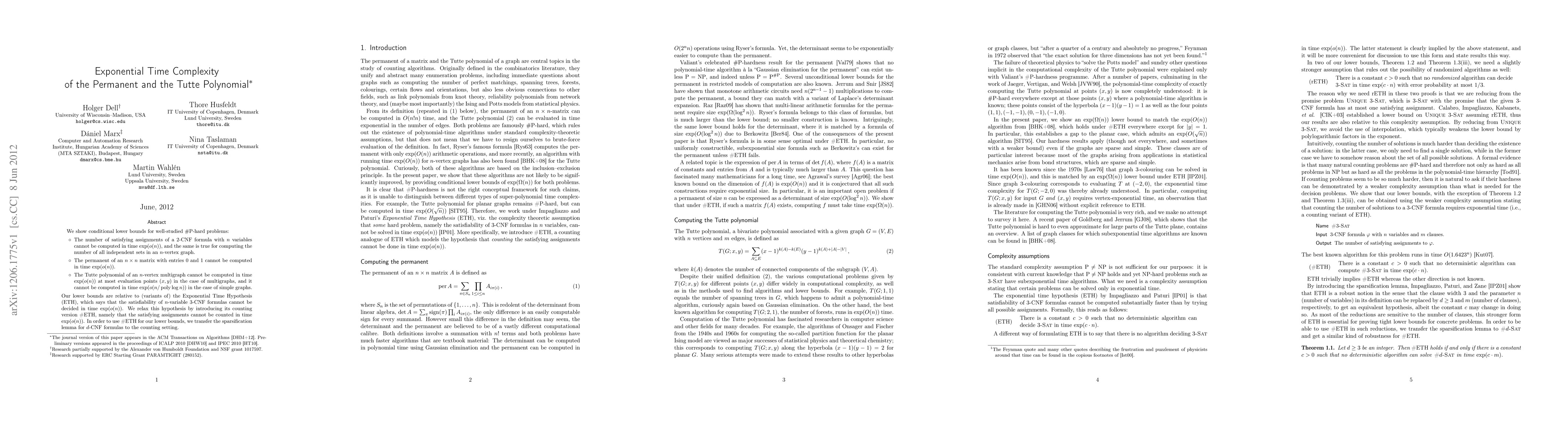 This paper presents conditional lower bounds showing that several #P-hard problems, including counting satisfying assignments, computing permanents, and evaluating Tutte polynomials, cannot be solved in exponential time exp(o(n)) relative to the #Exponential Time Hypothesis (ETH). The authors introduce a counting version of ETH and utilize a sparsification lemma to extend the results.