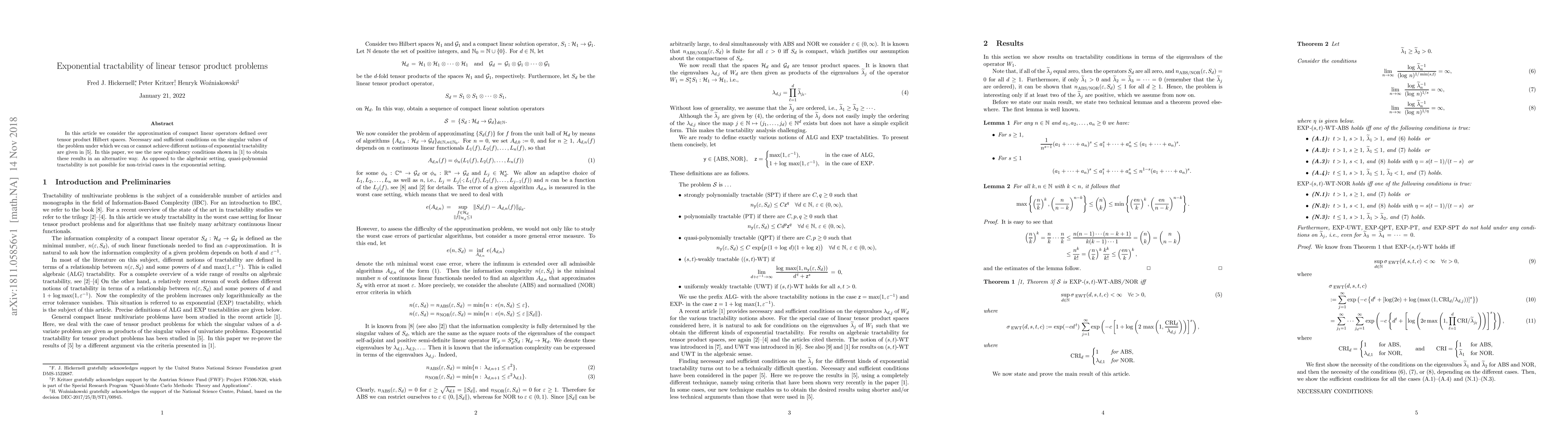 This paper explores the approximation of compact linear operators over tensor product Hilbert spaces, providing alternative conditions for exponential tractability based on singular values. Unlike the algebraic setting, quasi-polynomial tractability is not feasible in the exponential setting for non-trivial cases.