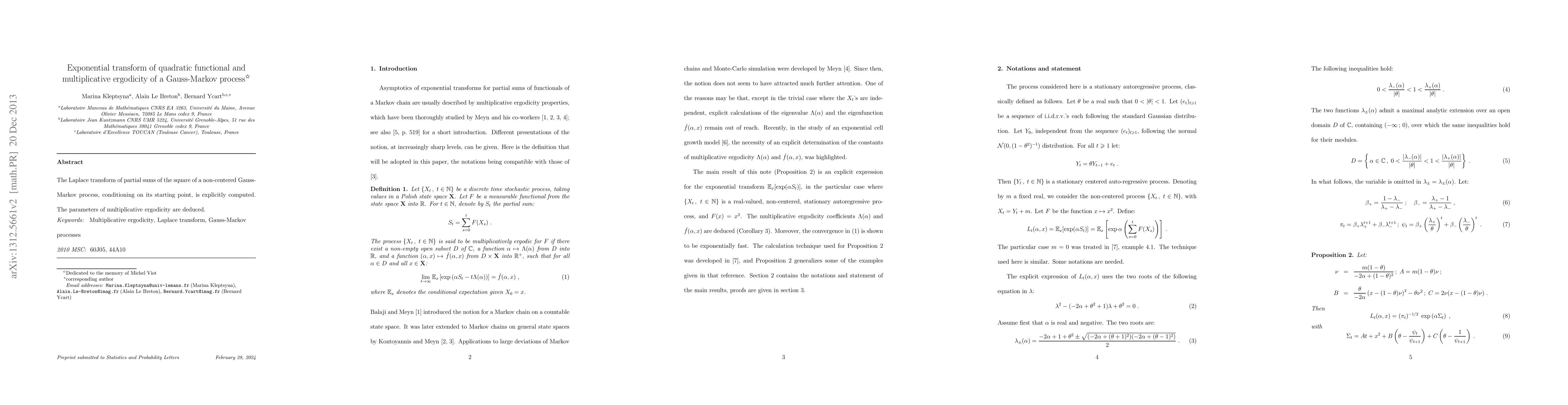 This paper computes the Laplace transform of partial sums of the square of a non-centered Gauss-Markov process, conditioned on its starting point, and deduces the parameters associated with multiplicative ergodicity.