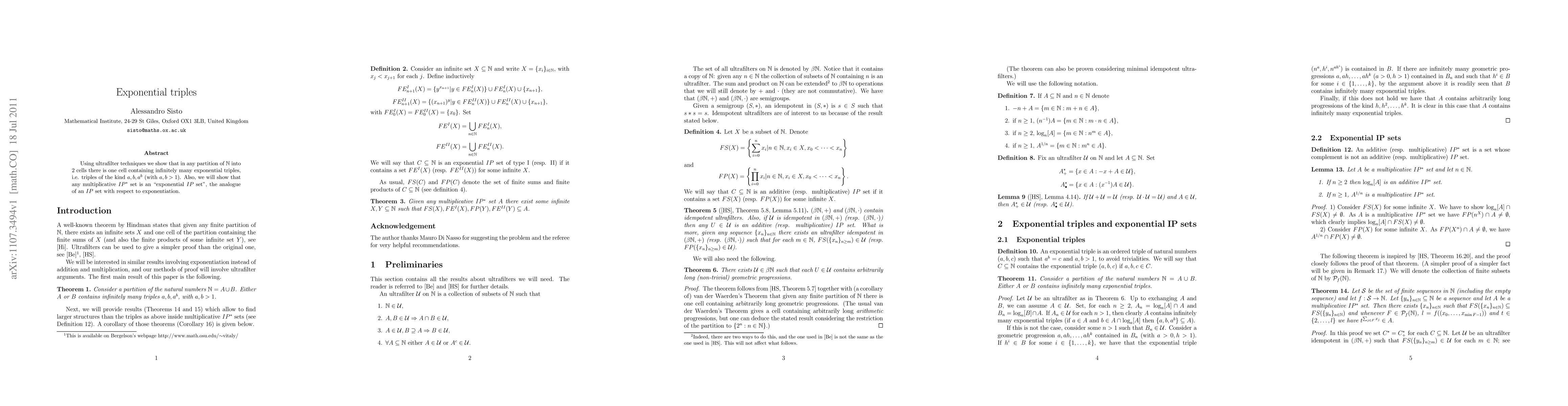 This paper demonstrates that any partition of the natural numbers into two sets contains one set with infinitely many exponential triples of the form $a,b,a^b$ (where $a,b>1$). Additionally, it proves that any multiplicative $IP^*$ set is equivalent to an "exponential $IP$ set" concerning exponentiation.