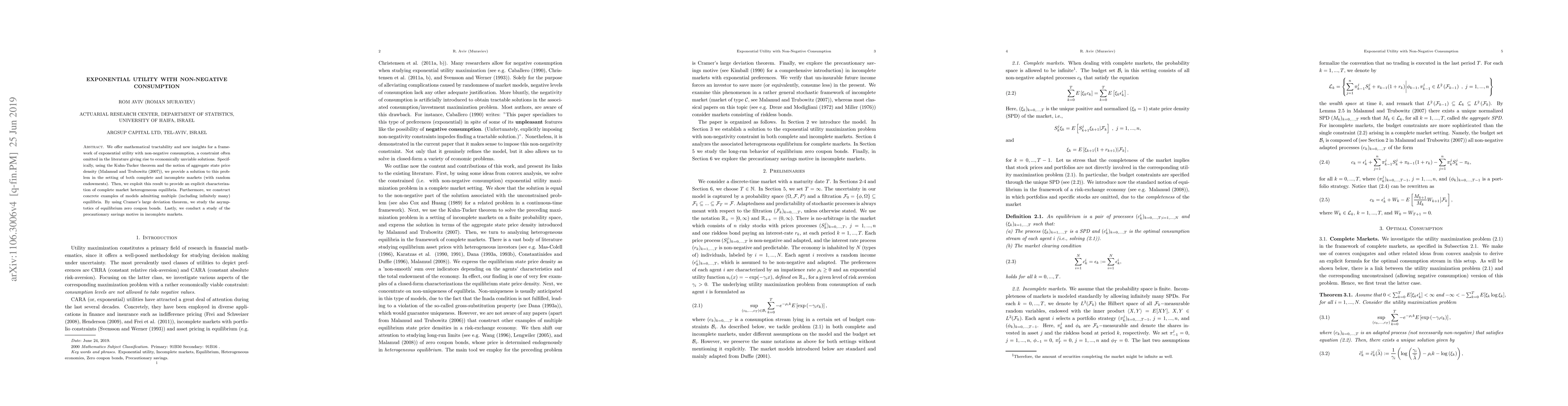 This paper develops a framework for exponential utility with non-negative consumption in complete and incomplete markets, providing new insights and tractability to address economic viability issues. It also explores the precautionary savings motive and characterizes complete market heterogeneous equilibria.