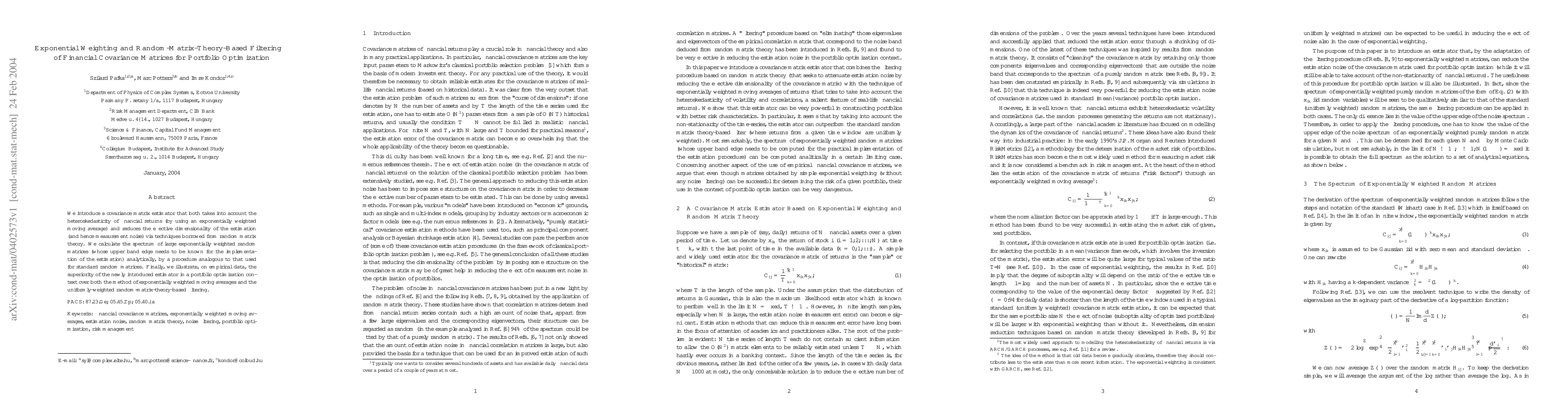 We introduce a covariance matrix estimator that both takes into account the heteroskedasticity of financial returns (by using an exponentially weighted moving average) and reduces the effective dimensionality of the estimation (and hence measurement noise) via techniques borrowed from random matrix theory. We calculate the spectrum of large exponentially weighted random matrices (whose upper band edge needs to be known for the implementation of the estimation) analytically, by a procedure analogous to that used for standard random matrices. Finally, we illustrate, on empirical data, the superiority of the newly introduced estimator in a portfolio optimization context over both the method of exponentially weighted moving averages and the uniformly-weighted random-matrix-theory-based filtering.