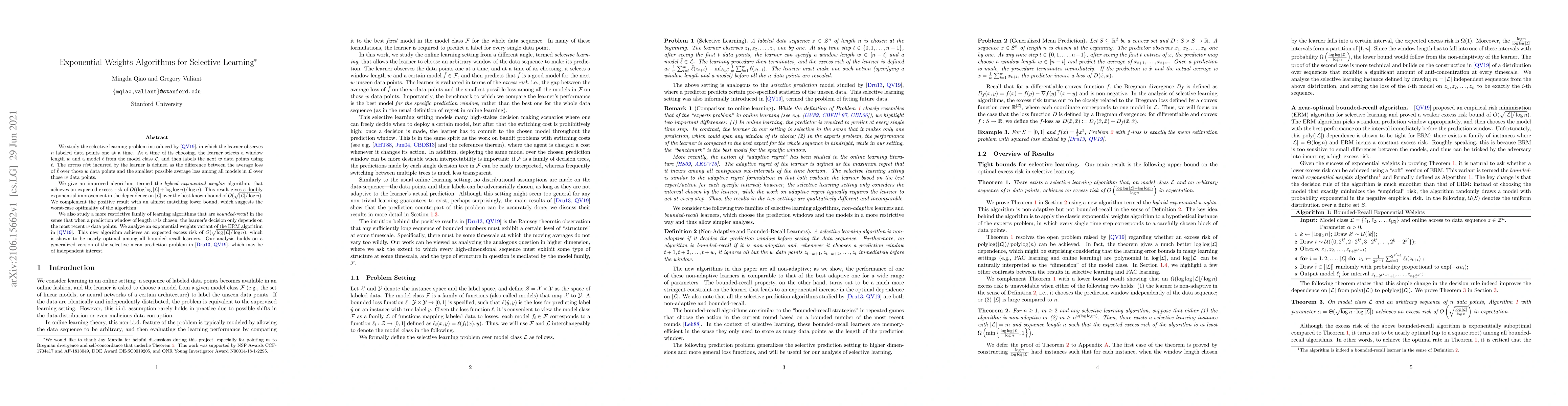 We study the selective learning problem introduced by Qiao and Valiant (2019), in which the learner observes $n$ labeled data points one at a time. At a time of its choosing, the learner selects a window length $w$ and a model $\hat\ell$ from the model class $\mathcal{L}$, and then labels the next $w$ data points using $\hat\ell$. The excess risk incurred by the learner is defined as the difference between the average loss of $\hat\ell$ over those $w$ data points and the smallest possible average loss among all models in $\mathcal{L}$ over those $w$ data points. We give an improved algorithm, termed the hybrid exponential weights algorithm, that achieves an expected excess risk of $O((\log\log|\mathcal{L}| + \log\log n)/\log n)$. This result gives a doubly exponential improvement in the dependence on $|\mathcal{L}|$ over the best known bound of $O(\sqrt{|\mathcal{L}|/\log n})$. We complement the positive result with an almost matching lower bound, which suggests the worst-case optimality of the algorithm. We also study a more restrictive family of learning algorithms that are bounded-recall in the sense that when a prediction window of length $w$ is chosen, the learner's decision only depends on the most recent $w$ data points. We analyze an exponential weights variant of the ERM algorithm in Qiao and Valiant (2019). This new algorithm achieves an expected excess risk of $O(\sqrt{\log |\mathcal{L}|/\log n})$, which is shown to be nearly optimal among all bounded-recall learners. Our analysis builds on a generalized version of the selective mean prediction problem in Drucker (2013); Qiao and Valiant (2019), which may be of independent interest.