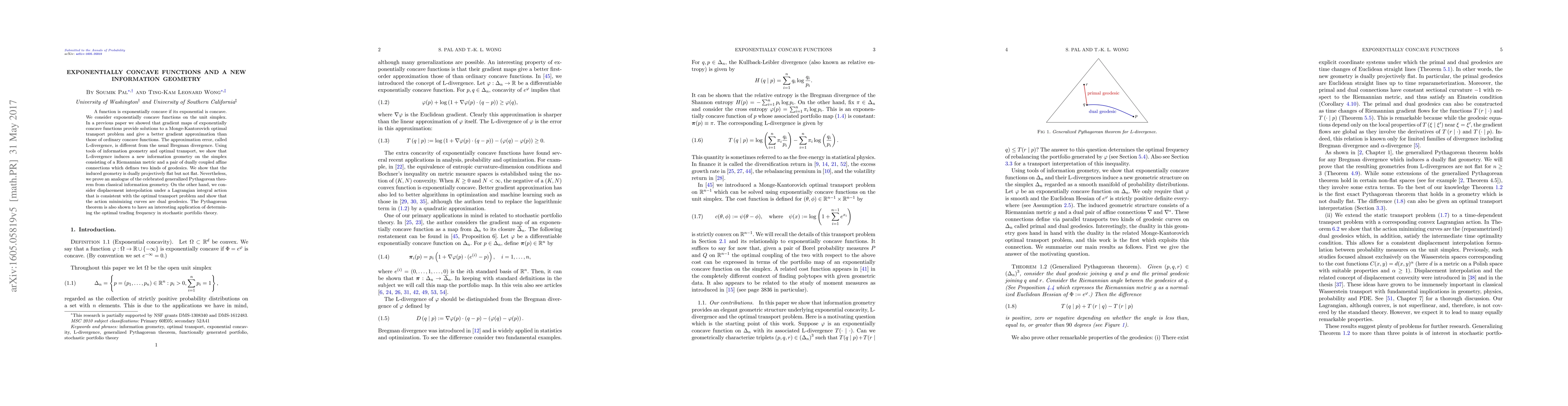 This paper explores exponentially concave functions on the unit simplex, demonstrating that their gradient maps solve optimal transport problems and provide superior gradient approximations. The new L-divergence metric induces a unique information geometry with dually coupled affine connections and non-flat geodesics, while still proving a generalized Pythagorean theorem, which finds application in determining optimal trading frequencies in stochastic portfolio theory.