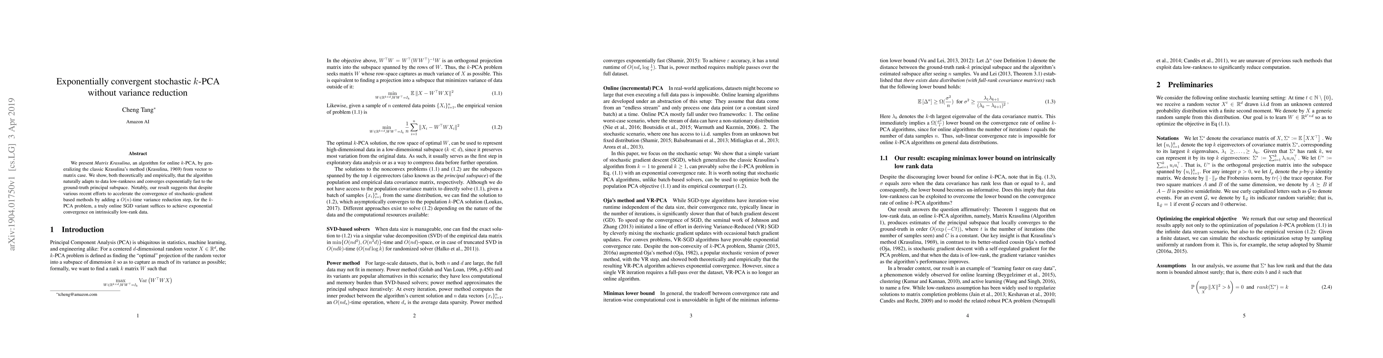 We present Matrix Krasulina, an algorithm for online k-PCA, by generalizing the classic Krasulina's method (Krasulina, 1969) from vector to matrix case. We show, both theoretically and empirically, that the algorithm naturally adapts to data low-rankness and converges exponentially fast to the ground-truth principal subspace. Notably, our result suggests that despite various recent efforts to accelerate the convergence of stochastic-gradient based methods by adding a O(n)-time variance reduction step, for the k-PCA problem, a truly online SGD variant suffices to achieve exponential convergence on intrinsically low-rank data.