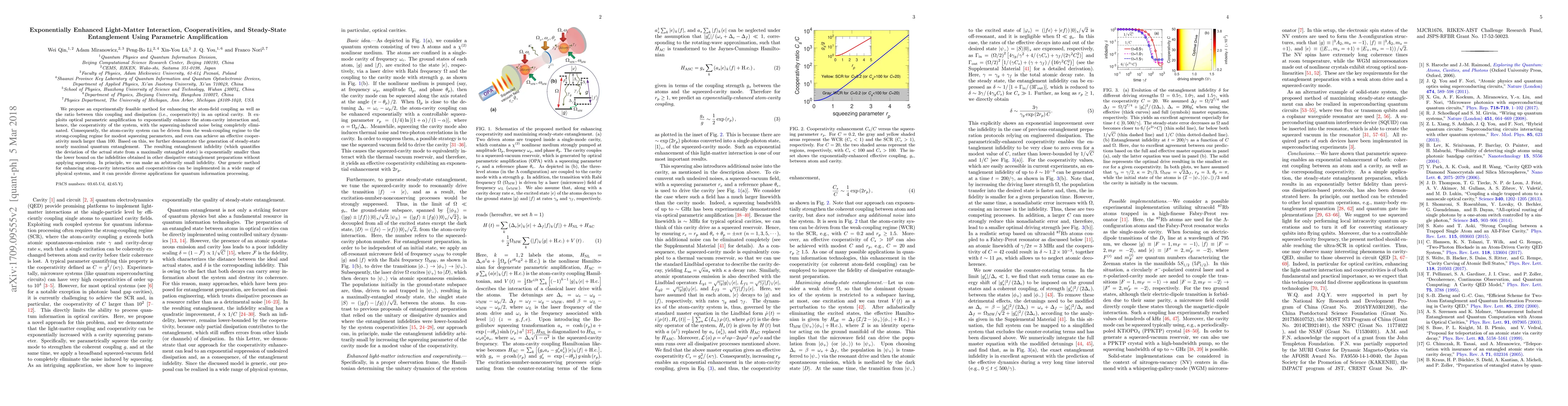 This paper proposes an experimentally feasible method using optical parametric amplification to exponentially enhance atom-cavity coupling and cooperativity, achieving nearly-maximal quantum entanglement with minimal infidelity. The approach eliminates squeezing-induced noise, enabling effective cooperativity over 100 and applications in quantum information processing.