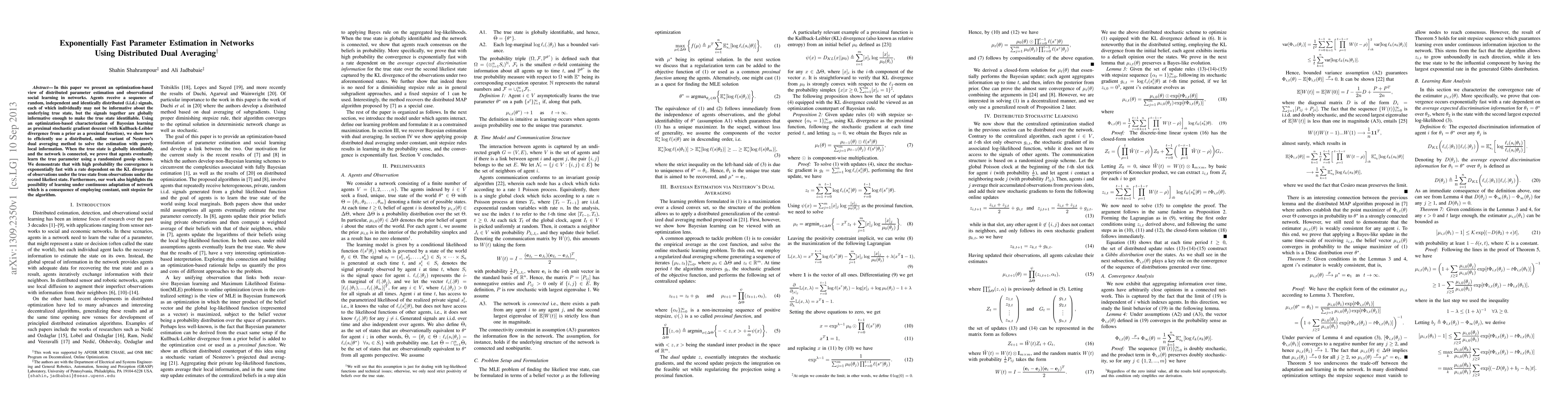 This paper presents a new method for distributed parameter estimation in networks using dual averaging, which can learn true parameters exponentially fast even with limited local information.