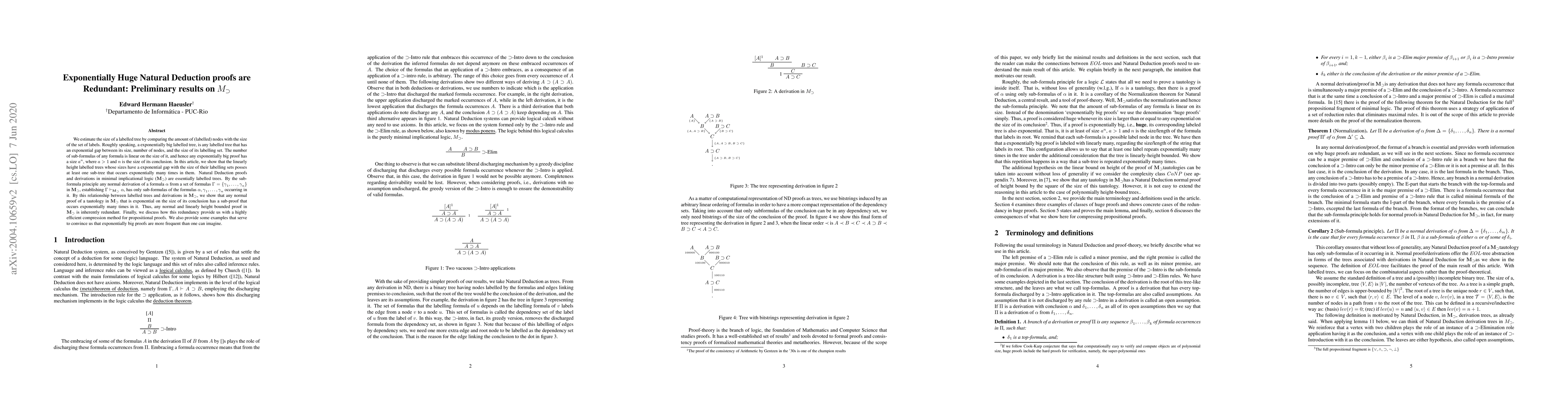 We estimate the size of a labelled tree by comparing the amount of (labelled) nodes with the size of the set of labels. Roughly speaking, a exponentially big labelled tree, is any labelled tree that has an exponential gap between its size, number of nodes, and the size of its labelling set. The number of sub-formulas of any formula is linear on the size of it, and hence any exponentially big proof has a size $a^n$, where $a>1$ and $n$ is the size of its conclusion. In this article, we show that the linearly height labelled trees whose sizes have an exponential gap with the size of their labelling sets posses at least one sub-tree that occurs exponentially many times in them. Natural Deduction proofs and derivations in minimal implicational logic ($M_\supset$) are essentially labelled trees. By the sub-formula principle any normal derivation of a formula $\alpha$ from a set of formulas $\Gamma=\{\gamma_1,\ldots,\gamma_n\}$ in $M_\supset$, establishing $\Gamma\vdash_{M_\supset}\alpha$, has only sub-formulas of the formulas $\alpha,\gamma_1,\ldots,\gamma_n$ occurring in it. By this relationship between labelled trees and derivations in $M_\supset$, we show that any normal proof of a tautology in $M_\supset$ that is exponential on the size of its conclusion has a sub-proof that occurs exponentially many times in it. Thus, any normal and linearly height bounded proof in $M_\supset$ is inherently redundant. Finally, we briefly discuss how this redundancy provides us with a highly efficient compression method for propositional proofs. We also provide some examples that serve to convince us that exponentially big proofs are more frequent than one can imagine.