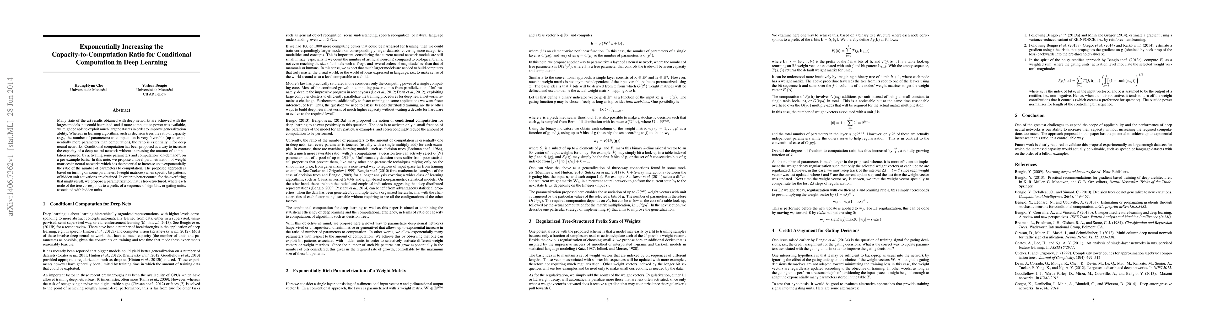 This paper proposes a novel method to exponentially increase the capacity-to-computation ratio in deep learning by using conditional computation. It introduces a tree-structured parametrization of weight matrices that activates parameters based on specific activation patterns, aiming to enhance model capacity without proportionally increasing computational load.