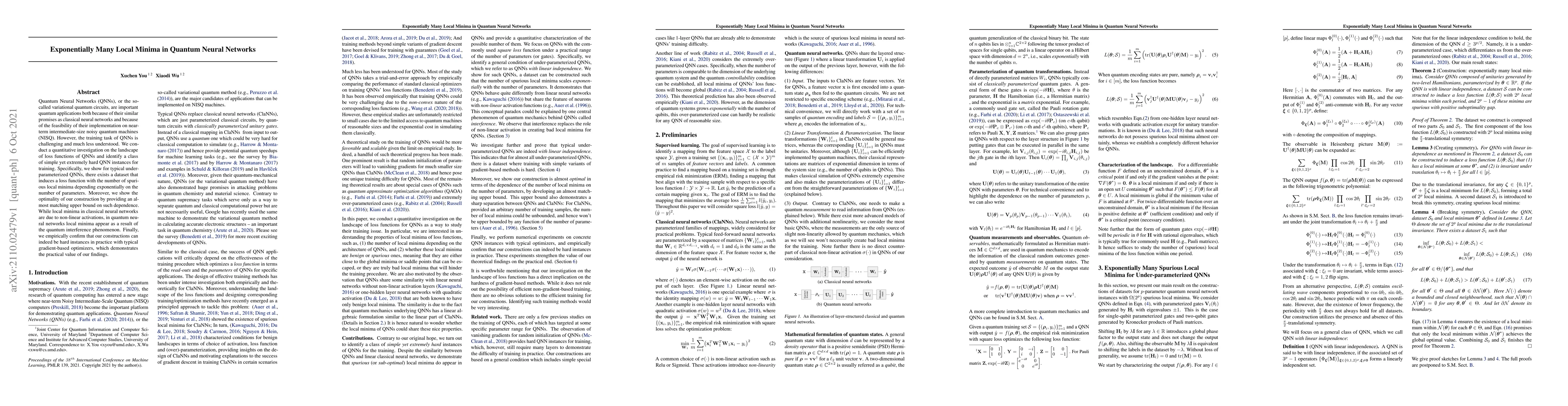 Quantum Neural Networks (QNNs), or the so-called variational quantum circuits, are important quantum applications both because of their similar promises as classical neural networks and because of the feasibility of their implementation on near-term intermediate-size noisy quantum machines (NISQ). However, the training task of QNNs is challenging and much less understood. We conduct a quantitative investigation on the landscape of loss functions of QNNs and identify a class of simple yet extremely hard QNN instances for training. Specifically, we show for typical under-parameterized QNNs, there exists a dataset that induces a loss function with the number of spurious local minima depending exponentially on the number of parameters. Moreover, we show the optimality of our construction by providing an almost matching upper bound on such dependence. While local minima in classical neural networks are due to non-linear activations, in quantum neural networks local minima appear as a result of the quantum interference phenomenon. Finally, we empirically confirm that our constructions can indeed be hard instances in practice with typical gradient-based optimizers, which demonstrates the practical value of our findings.