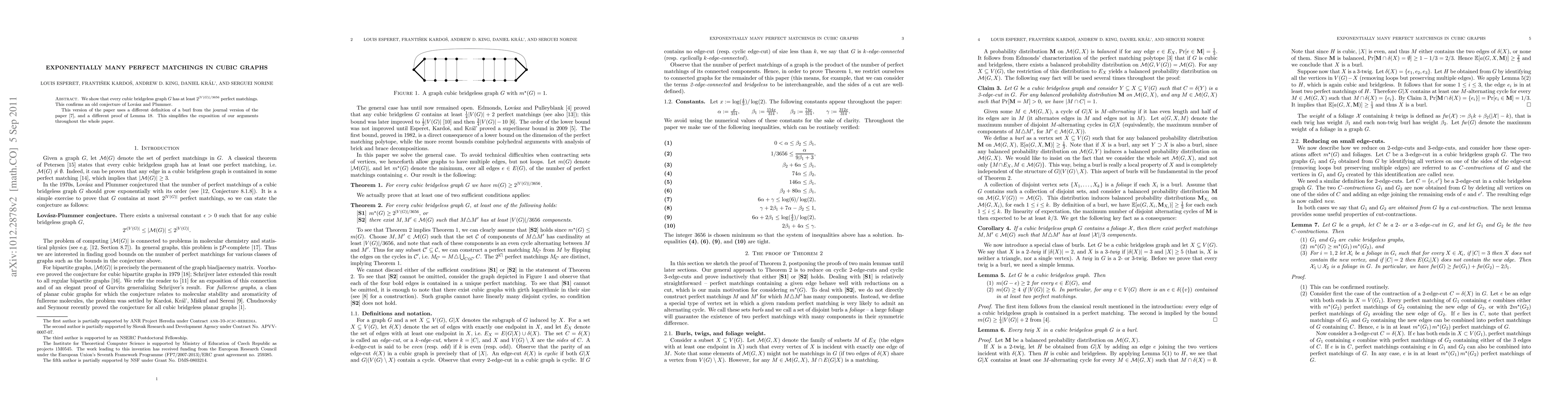This paper confirms an old conjecture by Lovasz and Plummer, demonstrating that every cubic bridgeless graph contains at least 2^(|V(G)|/3656) perfect matchings. The authors present a simplified proof using a new definition of a burl and a revised Lemma 18.