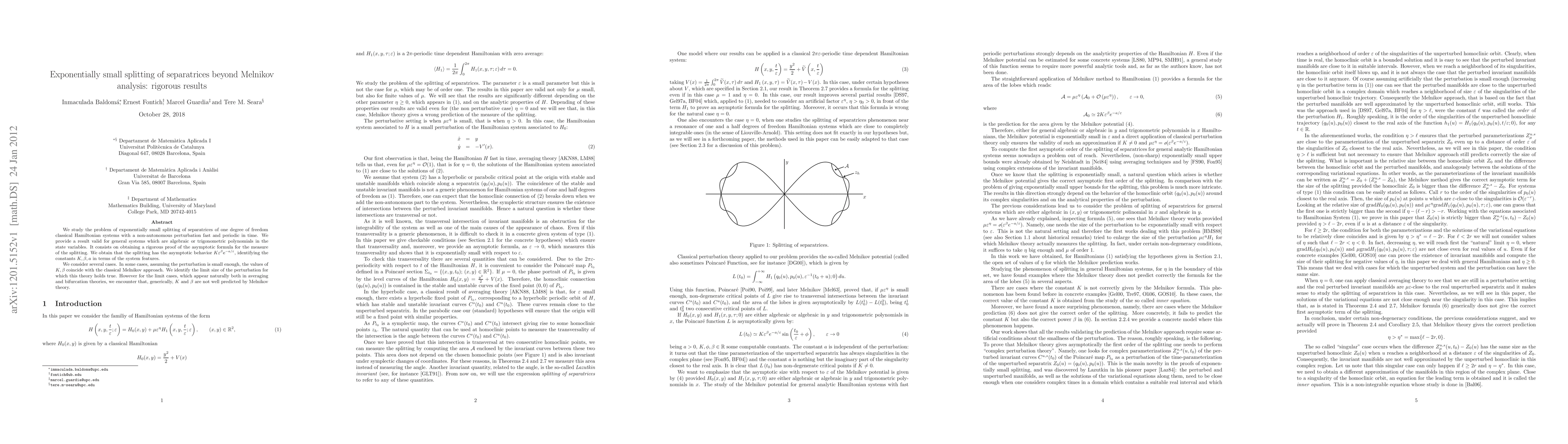This paper explores the exponentially small splitting of separatrices in classical Hamiltonian systems with non-autonomous periodic perturbations, providing a rigorous proof of the asymptotic formula for the splitting measure. It identifies constants in terms of system features, showing that while Melnikov theory works for small perturbations, it fails for larger perturbations where the splitting behavior is more complex.