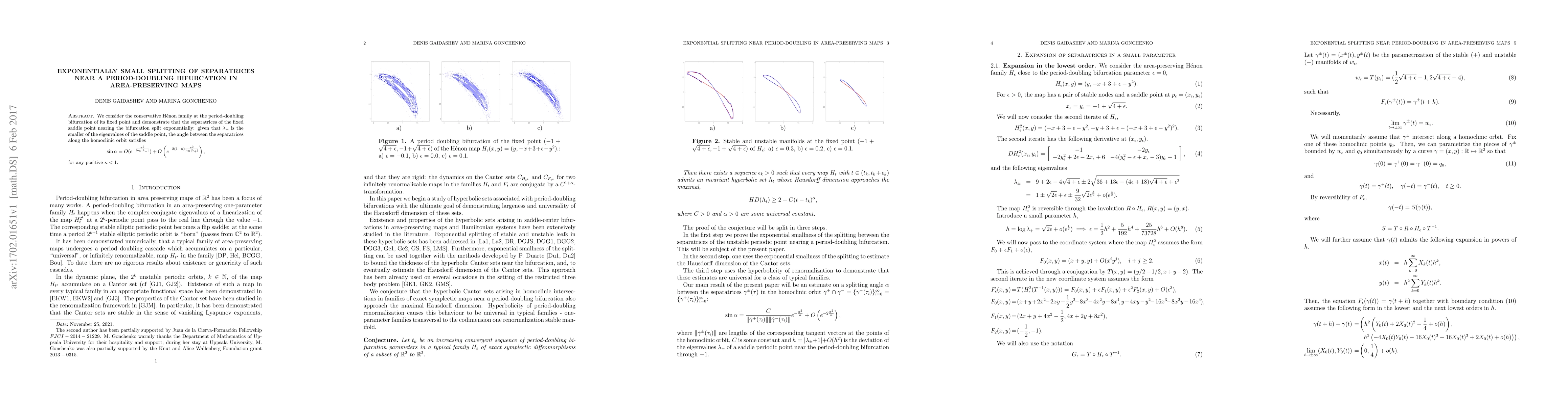 This paper investigates the conservative Hénon family near its period-doubling bifurcation, showing that the separatrices of the fixed saddle point split exponentially as the bifurcation is approached. The angle between the separatrices along the homoclinic orbit is shown to be $O(e^{-{\pi^2 \over \log |\lambda_+|}})$, indicating an exponentially small splitting.