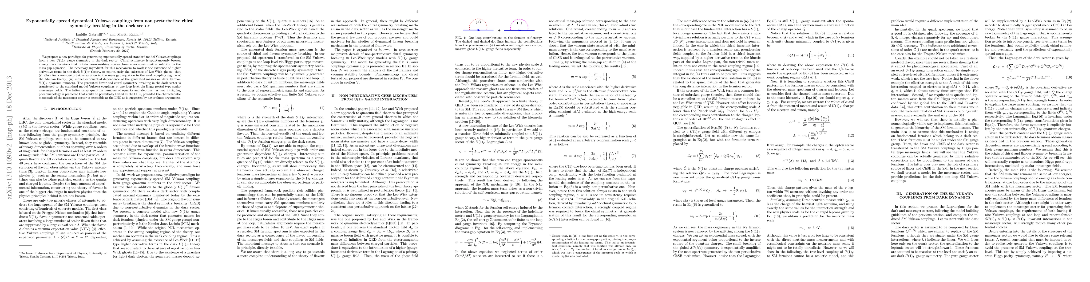 We propose a new paradigm for generating exponentially spread standard model Yukawa couplings from a new $U(1)_F$ gauge symmetry in the dark sector. Chiral symmetry is spontaneously broken among dark fermions that obtain non-vanishing masses from a non-perturbative solution to the mass gap equation. The necessary ingredient for this mechanism to work is the existence of higher derivative terms in the dark $U(1)_F$ theory, or equivalently the existence of Lee-Wick ghosts, that (i) allow for a non-perturbative solution to the mass gap equation in the weak coupling regime of the Abelian theory; (ii) induce exponential dependence of the generated masses on dark fermion $U(1)_F$ quantum numbers. The generated flavor and chiral symmetry breaking in the dark sector is transferred to the standard model Yukawa couplings at one loop level via Higgs portal type scalar messenger fields. The latter carry quantum numbers of squarks and sleptons. A new intriguing phenomenology is predicted that could be potentially tested at the LHC, provided the characteristic mass scale of the messenger sector is accessible at the LHC as is suggested by naturalness arguments.