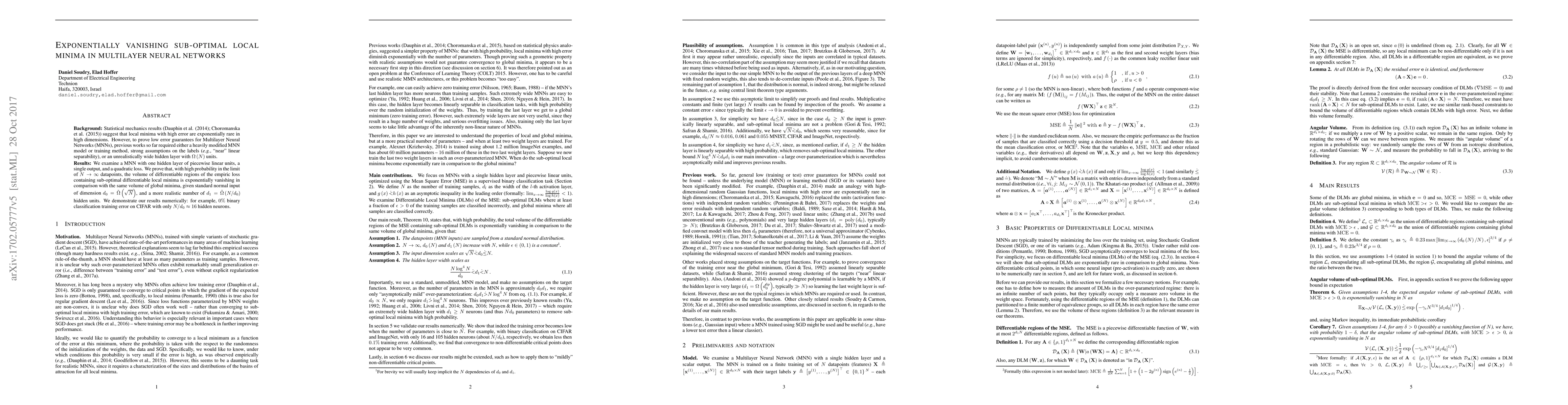 This paper proves that in high-dimensional settings, multilayer neural networks with a realistic number of hidden units exhibit exponentially fewer sub-optimal local minima compared to global minima, thus providing low error guarantees without requiring unrealistic assumptions or modifications. Numerical results demonstrate near-zero classification error on CIFAR data.