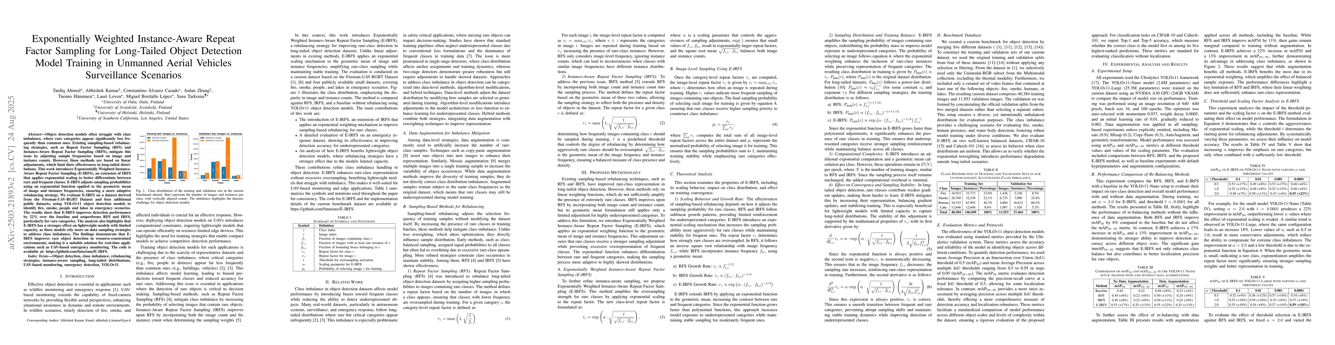 Object detection models often struggle with class imbalance, where rare categories appear significantly less frequently than common ones. Existing sampling-based rebalancing strategies, such as Repeat Factor Sampling (RFS) and Instance-Aware Repeat Factor Sampling (IRFS), mitigate this issue by adjusting sample frequencies based on image and instance counts. However, these methods are based on linear adjustments, which limit their effectiveness in long-tailed distributions. This work introduces Exponentially Weighted Instance-Aware Repeat Factor Sampling (E-IRFS), an extension of IRFS that applies exponential scaling to better differentiate between rare and frequent classes. E-IRFS adjusts sampling probabilities using an exponential function applied to the geometric mean of image and instance frequencies, ensuring a more adaptive rebalancing strategy. We evaluate E-IRFS on a dataset derived from the Fireman-UAV-RGBT Dataset and four additional public datasets, using YOLOv11 object detection models to identify fire, smoke, people and lakes in emergency scenarios. The results show that E-IRFS improves detection performance by 22\% over the baseline and outperforms RFS and IRFS, particularly for rare categories. The analysis also highlights that E-IRFS has a stronger effect on lightweight models with limited capacity, as these models rely more on data sampling strategies to address class imbalance. The findings demonstrate that E-IRFS improves rare object detection in resource-constrained environments, making it a suitable solution for real-time applications such as UAV-based emergency monitoring. The code is available at: https://github.com/futurians/E-IRFS.