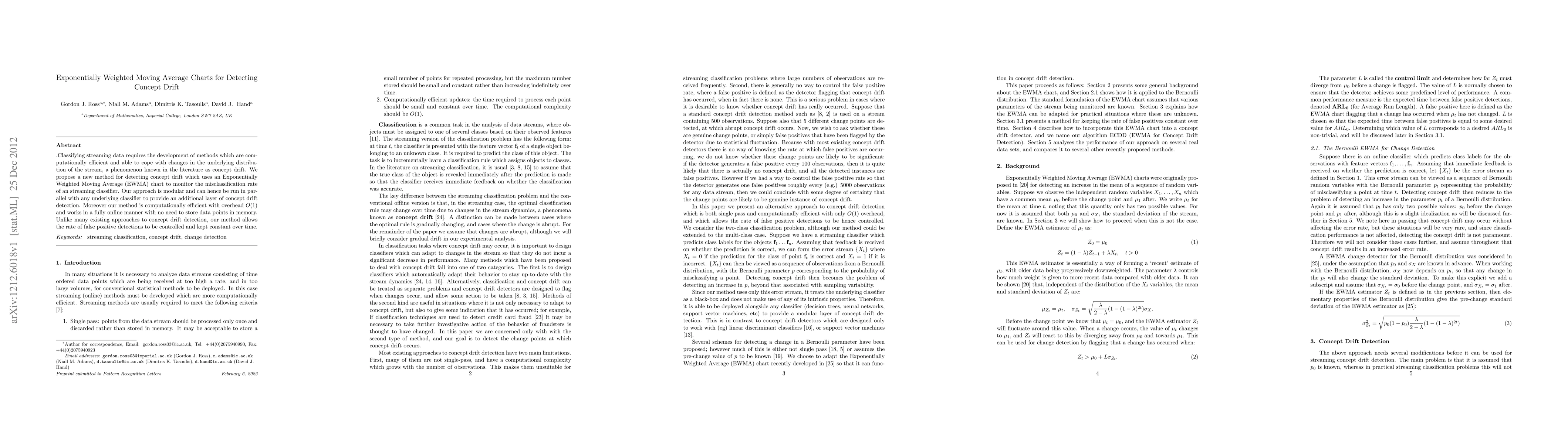 This paper proposes an Exponentially Weighted Moving Average (EWMA) chart for detecting concept drift in streaming data classification, offering a computationally efficient, modular, and fully online method with constant false positive rate control. The approach runs in parallel with any classifier with minimal overhead.