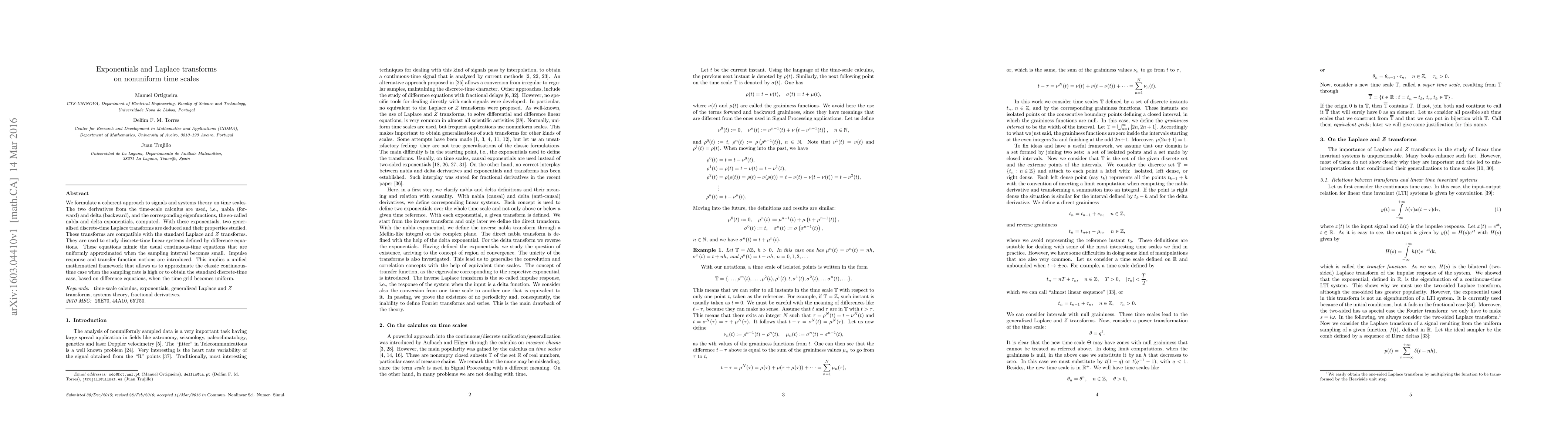 This paper develops a unified framework for signals and systems theory on nonuniform time scales using time-scale calculus. It introduces nabla and delta exponentials and deduces two generalized discrete-time Laplace transforms, compatible with standard transforms, to study discrete-time linear systems defined by difference equations.