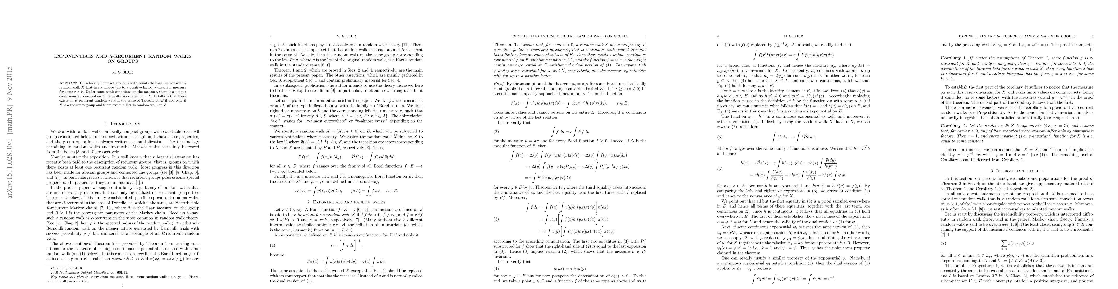On a locally compact group $E$ with countable base, we consider a random walk $X$ that has a unique (up to a positive factor) $r$-invariant measure for some $r>0$. Under some weak conditions on the measure, there is a unique continuous exponential on $E$ naturally associated with $X$. It follows that there exists an $R$-recurrent random walk in the sense of Tweedie on $E$ if and only if $E$ is a recurrent group and there exists a Harris random walk on~$E$.