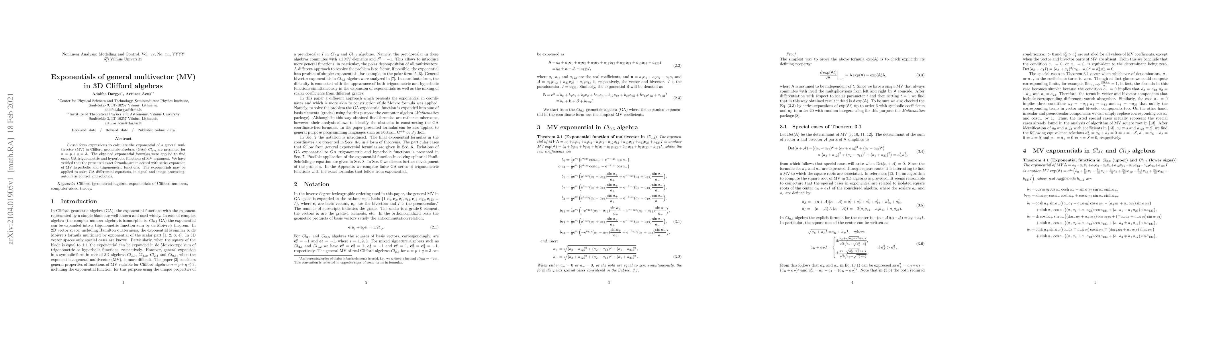Researchers developed closed-form expressions for calculating the exponential of a general multivector in 3D Clifford algebras, with potential applications in solving GA differential equations and signal/image processing.