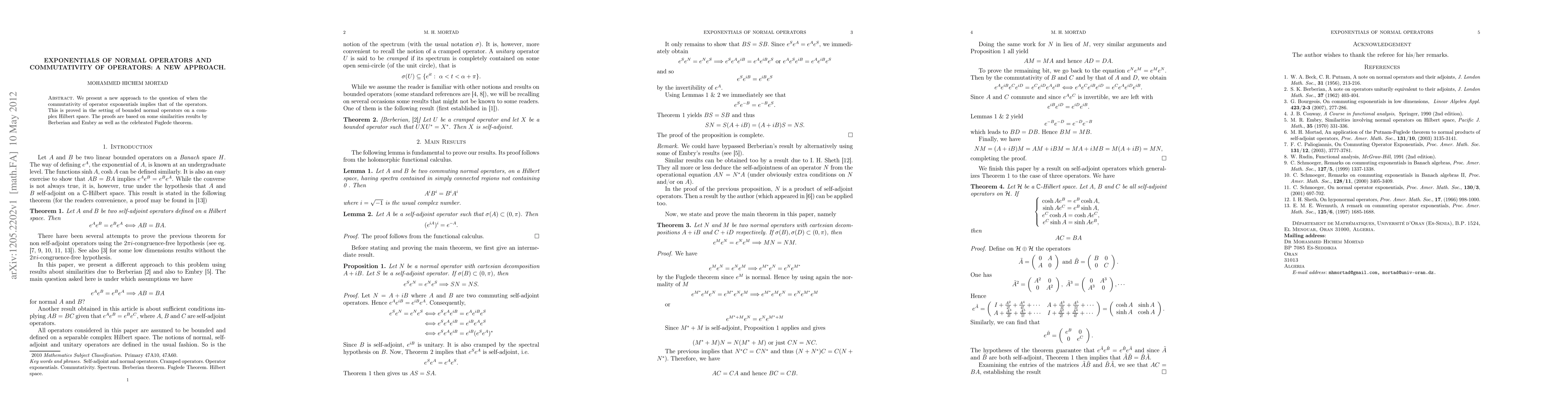 We present a new approach to the question of when the commutativity of operator exponentials implies that of the operators. This is proved in the setting of bounded normal operators on a complex Hilbert space. The proofs are based on some similarities results by Berberian and Embry as well as the celebrated Fuglede theorem.
