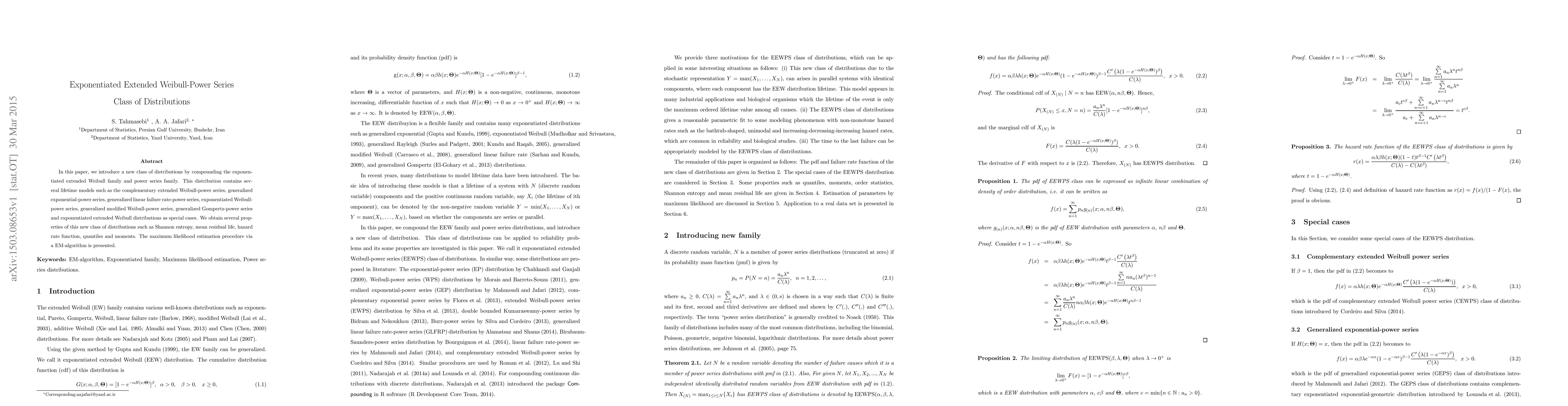 This paper presents a new class of distributions combining the exponentiated extended Weibull family and power series, encompassing several lifetime models as special cases. The study derives properties like Shannon entropy, mean residual life, hazard rate, and moments, alongside a maximum likelihood estimation method using the EM-algorithm.