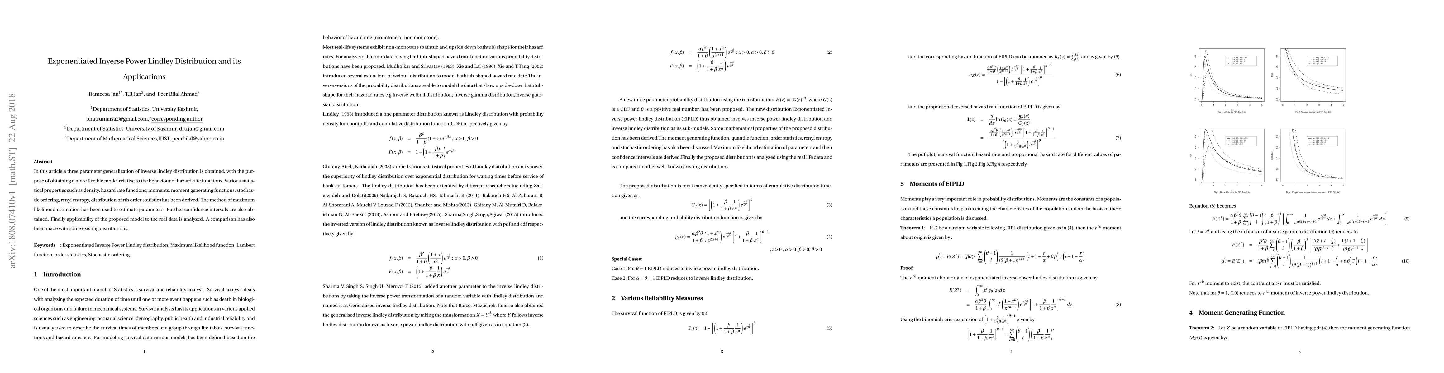 This paper introduces a three-parameter exponentiated inverse power Lindley distribution, deriving its statistical properties and employing maximum likelihood estimation for parameter estimation. The model's flexibility is demonstrated through real data analysis and comparison with existing distributions.