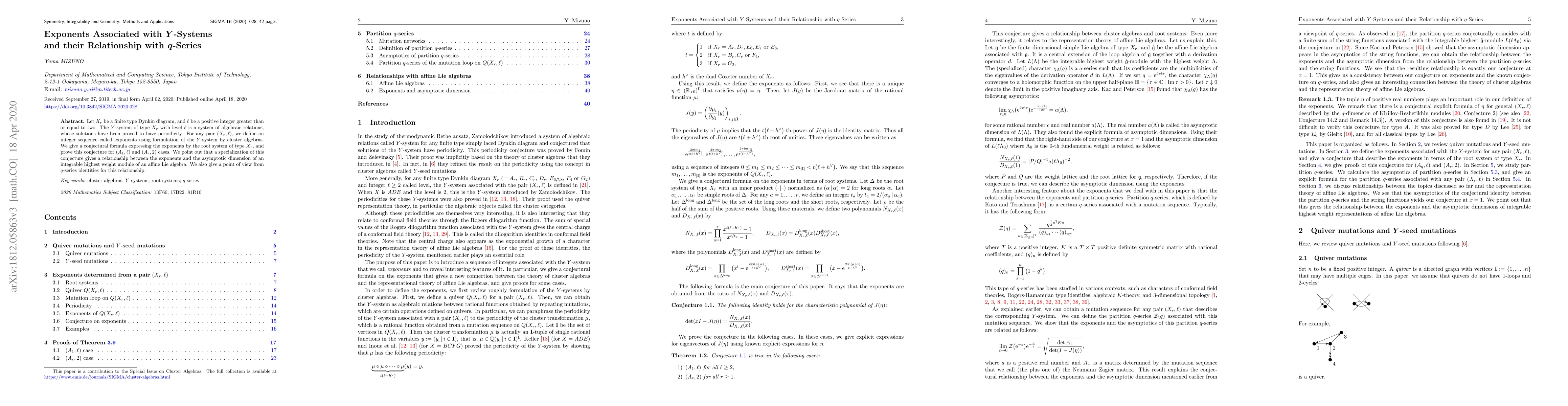 Let $X_r$ be a finite type Dynkin diagram, and $\ell$ be a positive integer greater than or equal to two. The $Y$-system of type $X_r$ with level $\ell$ is a system of algebraic relations, whose solutions have been proved to have periodicity. For any pair $(X_r, \ell)$, we define an integer sequence called exponents using formulation of the $Y$-system by cluster algebras. We give a conjectural formula expressing the exponents by the root system of type $X_r$, and prove this conjecture for $(A_1,\ell)$ and $(A_r, 2)$ cases. We point out that a specialization of this conjecture gives a relationship between the exponents and the asymptotic dimension of an integrable highest weight module of an affine Lie algebra. We also give a point of view from $q$-series identities for this relationship.