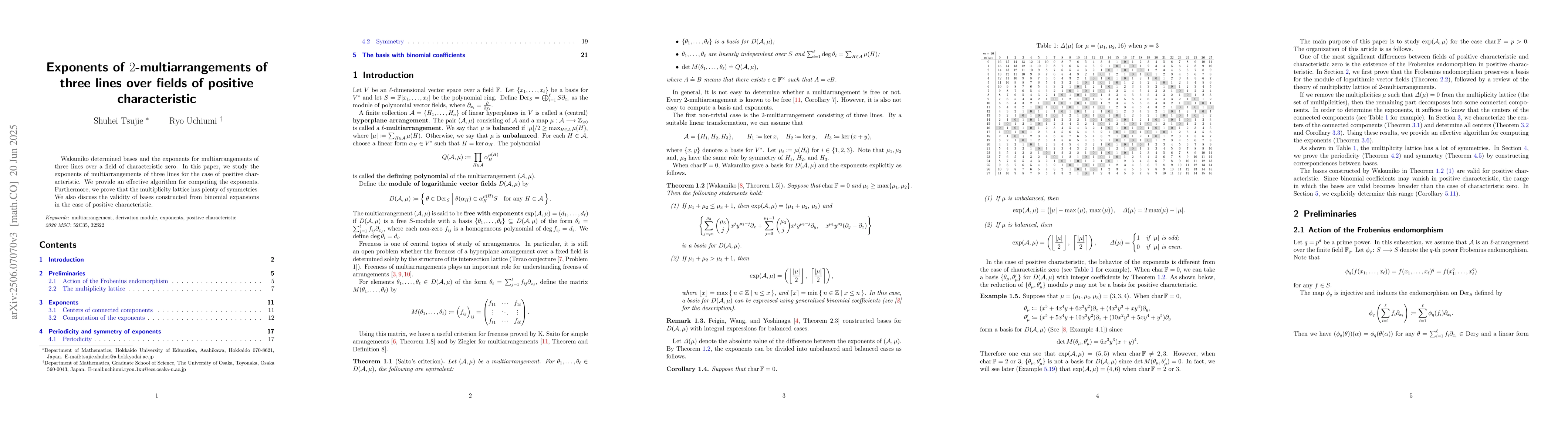 This paper presents an algorithm for computing exponents of 2-multiarrangements of three lines over fields of positive characteristic, a task previously challenging due to lack of explicit methods. It also reveals symmetries in the multiplicity lattice and discusses the applicability of bases from binomial expansions in this context.