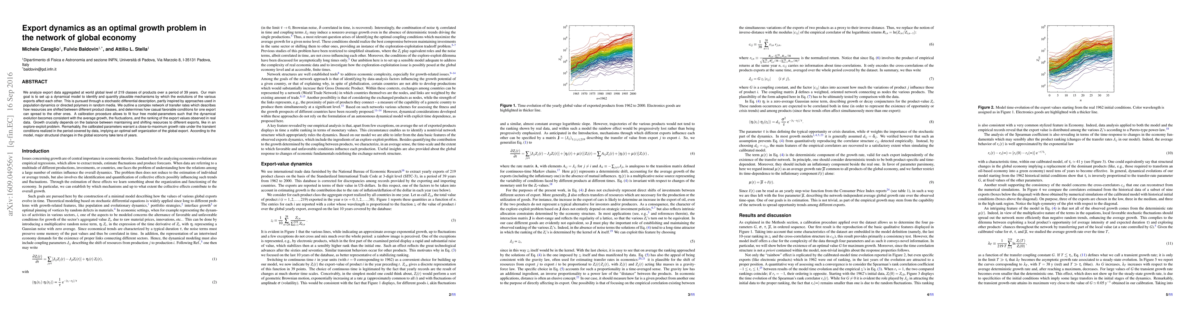 We analyze export data aggregated at world global level of 219 classes of products over a period of 39 years. Our main goal is to set up a dynamical model to identify and quantify plausible mechanisms by which the evolutions of the various exports affect each other. This is pursued through a stochastic differential description, partly inspired by approaches used in population dynamics or directed polymers in random media. We outline a complex network of transfer rates which describes how resources are shifted between different product classes, and determines how casual favorable conditions for one export can spread to the other ones. A calibration procedure allows to fit four free model-parameters such that the dynamical evolution becomes consistent with the average growth, the fluctuations, and the ranking of the export values observed in real data. Growth crucially depends on the balance between maintaining and shifting resources to different exports, like in an explore-exploit problem. Remarkably, the calibrated parameters warrant a close-to-maximum growth rate under the transient conditions realized in the period covered by data, implying an optimal self organization of the global export. According to the model, major structural changes in the global economy take tens of years.